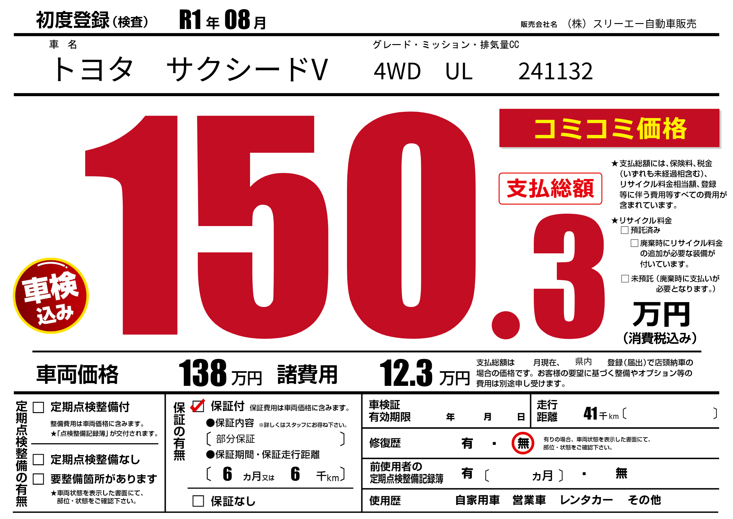 保証付き 保証内容(部分保証) 6ヶ月または(6)千kmまで |