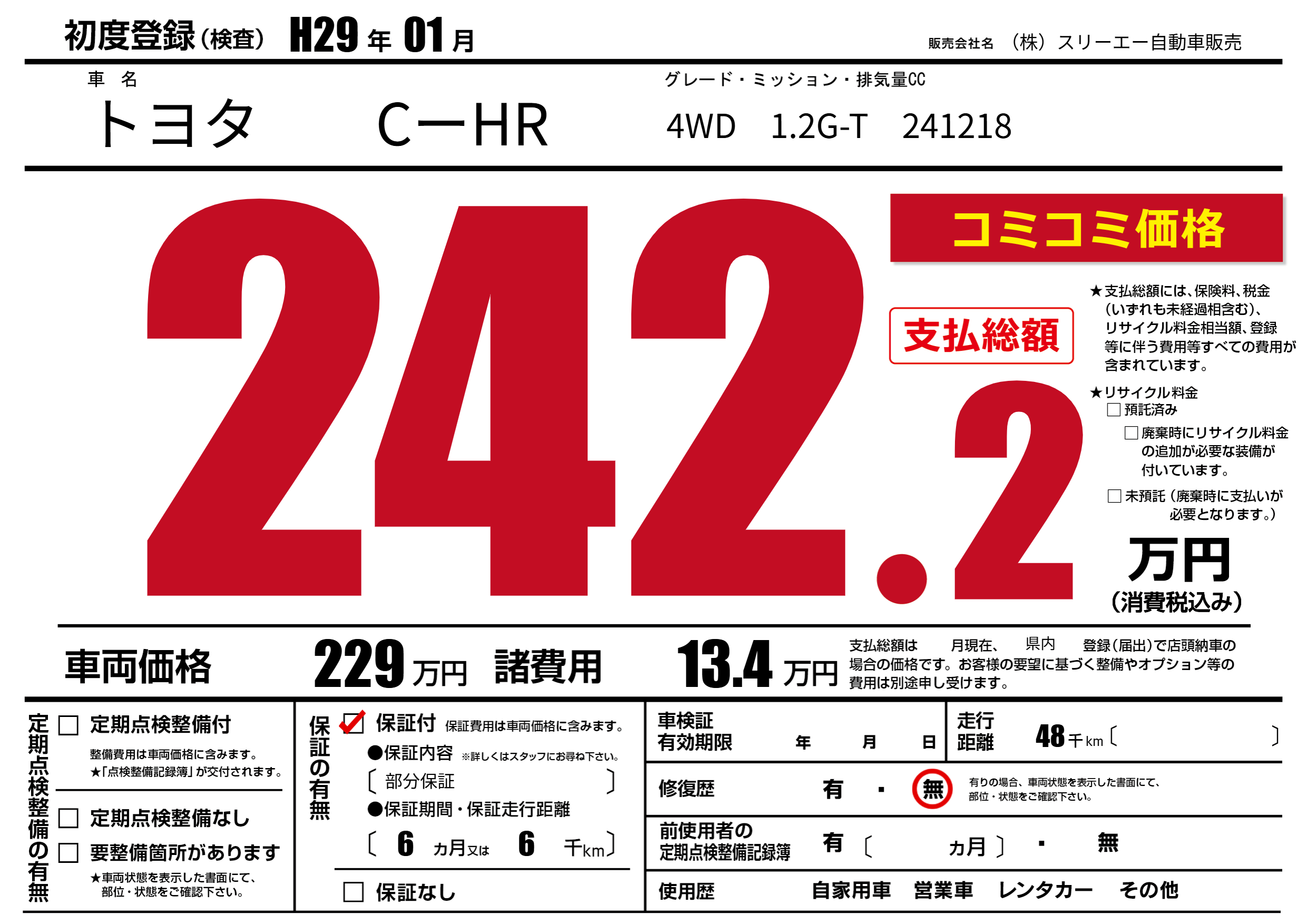 | 走行キロ | 4.8万km | 初年度登録 | H29年01月 |