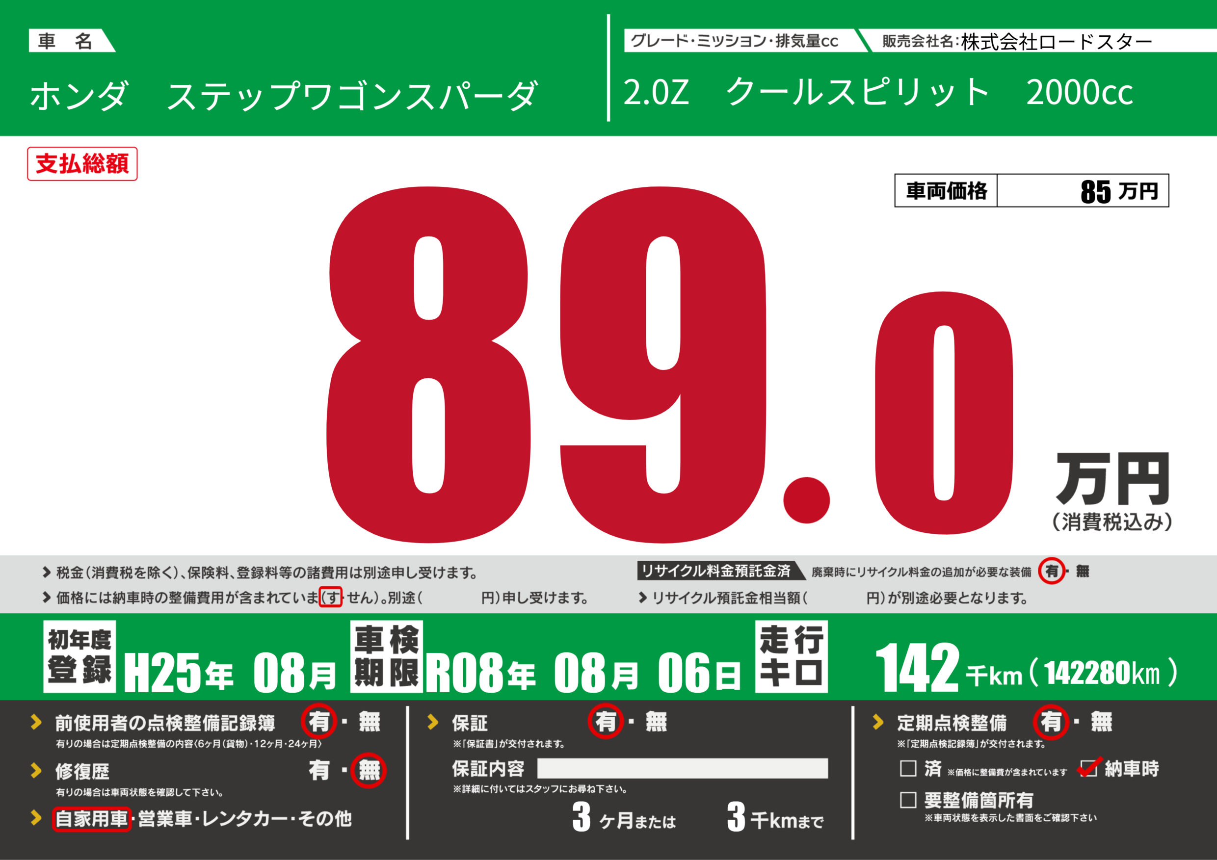 | 車名 | ホンダ ステップワゴンスパーダ | グレード ミッション 排気量 |