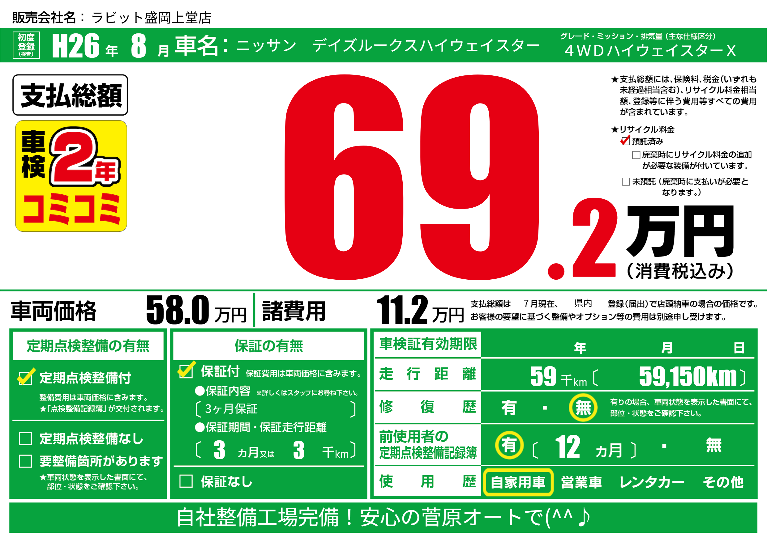 | 走行キロ | 5.9万km | 初年度登録 | H26年8月 |