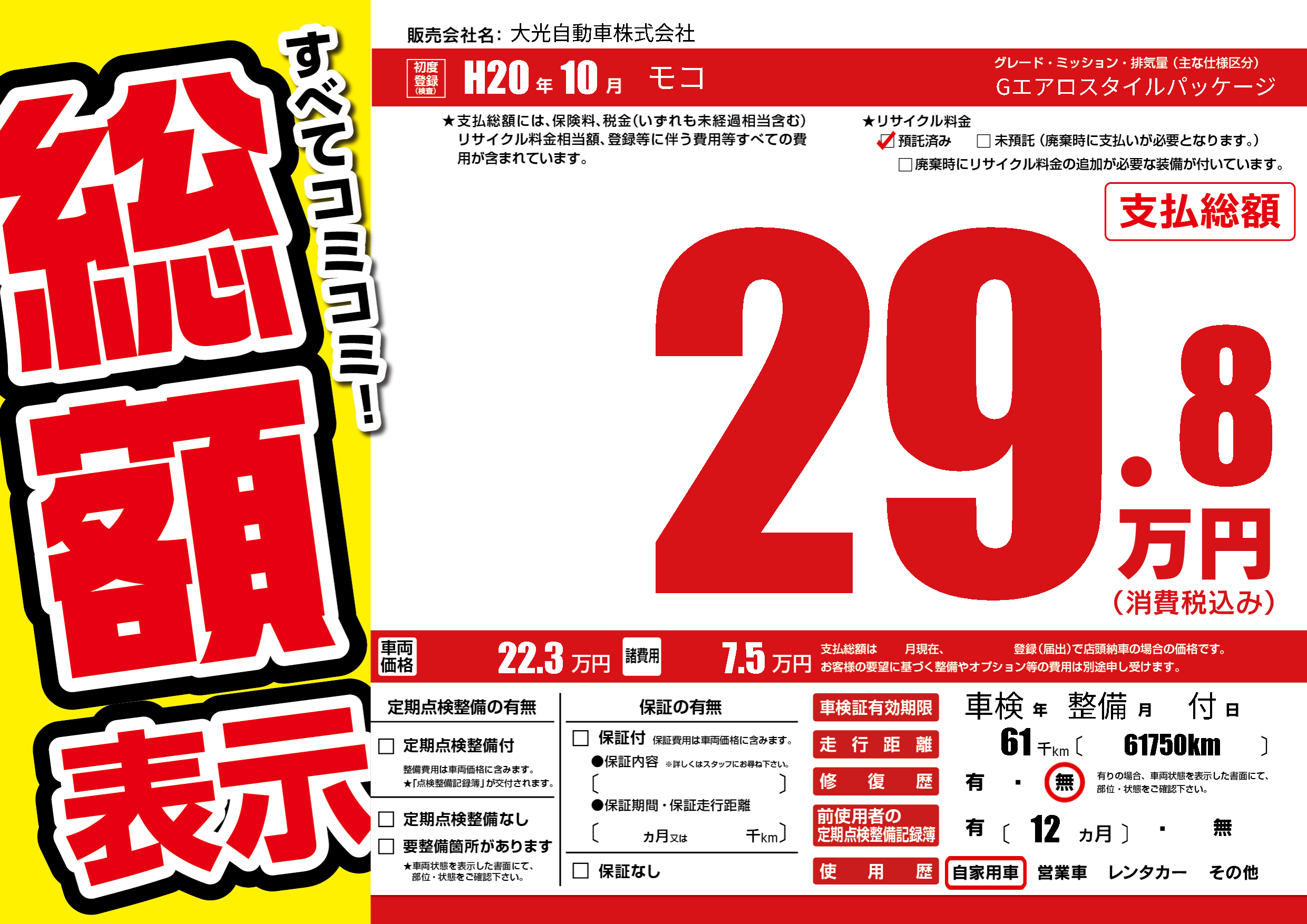 | 走行キロ | 6.1万km | 初年度登録 | H20年10月 |