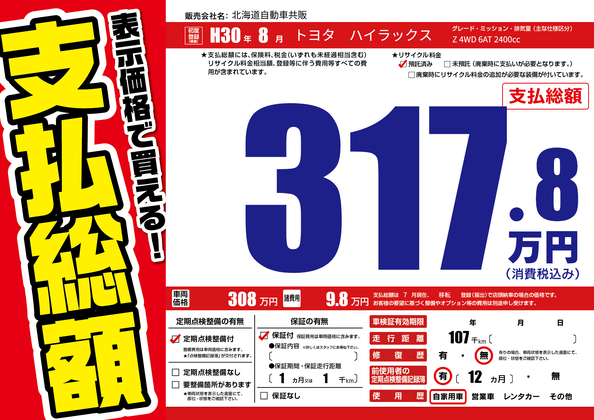| 走行キロ | 10.7万km | 初年度登録 | H30年8月 |