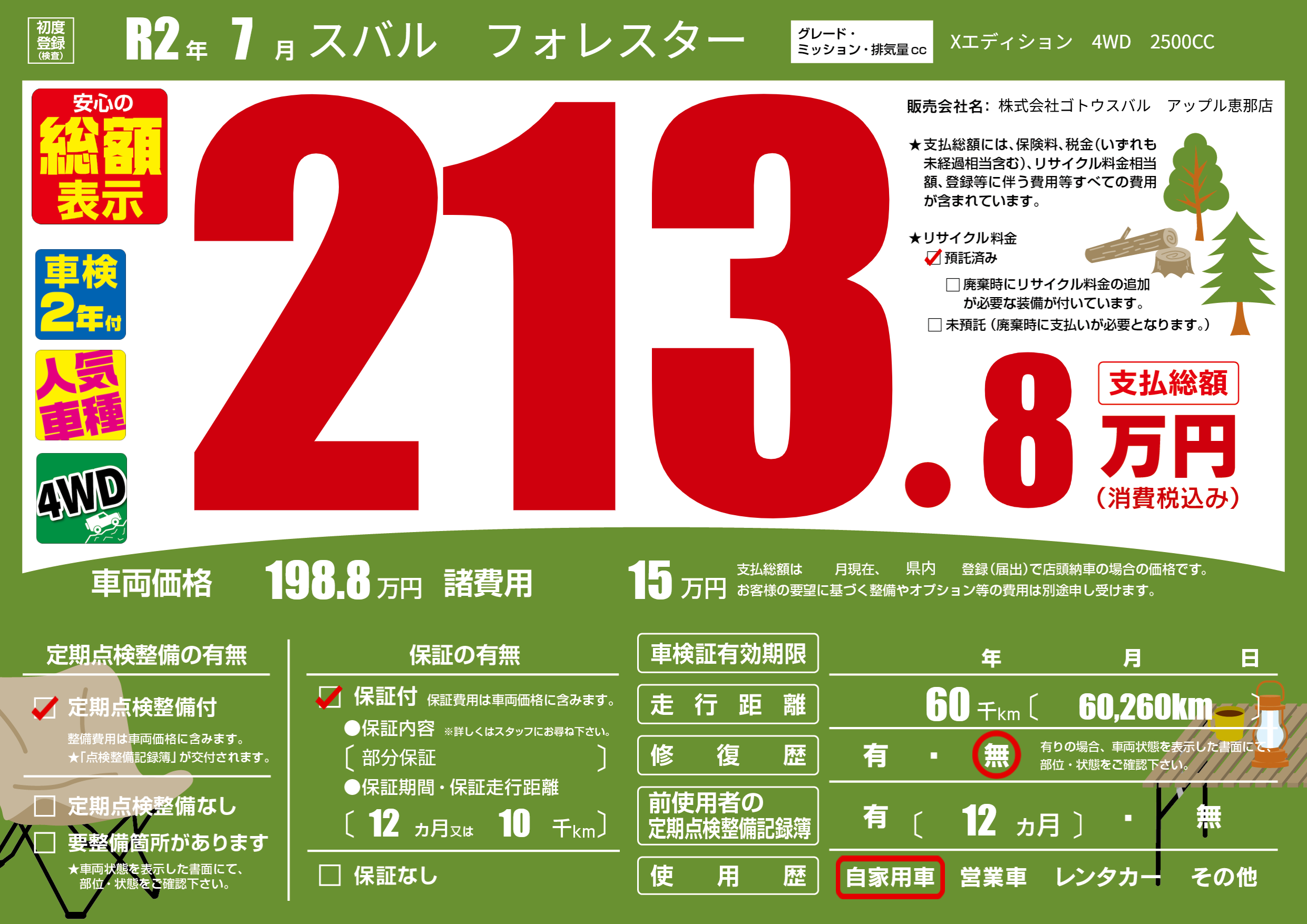 | 車名 | スバル フォレスター | グレード ミッション 排気量 |