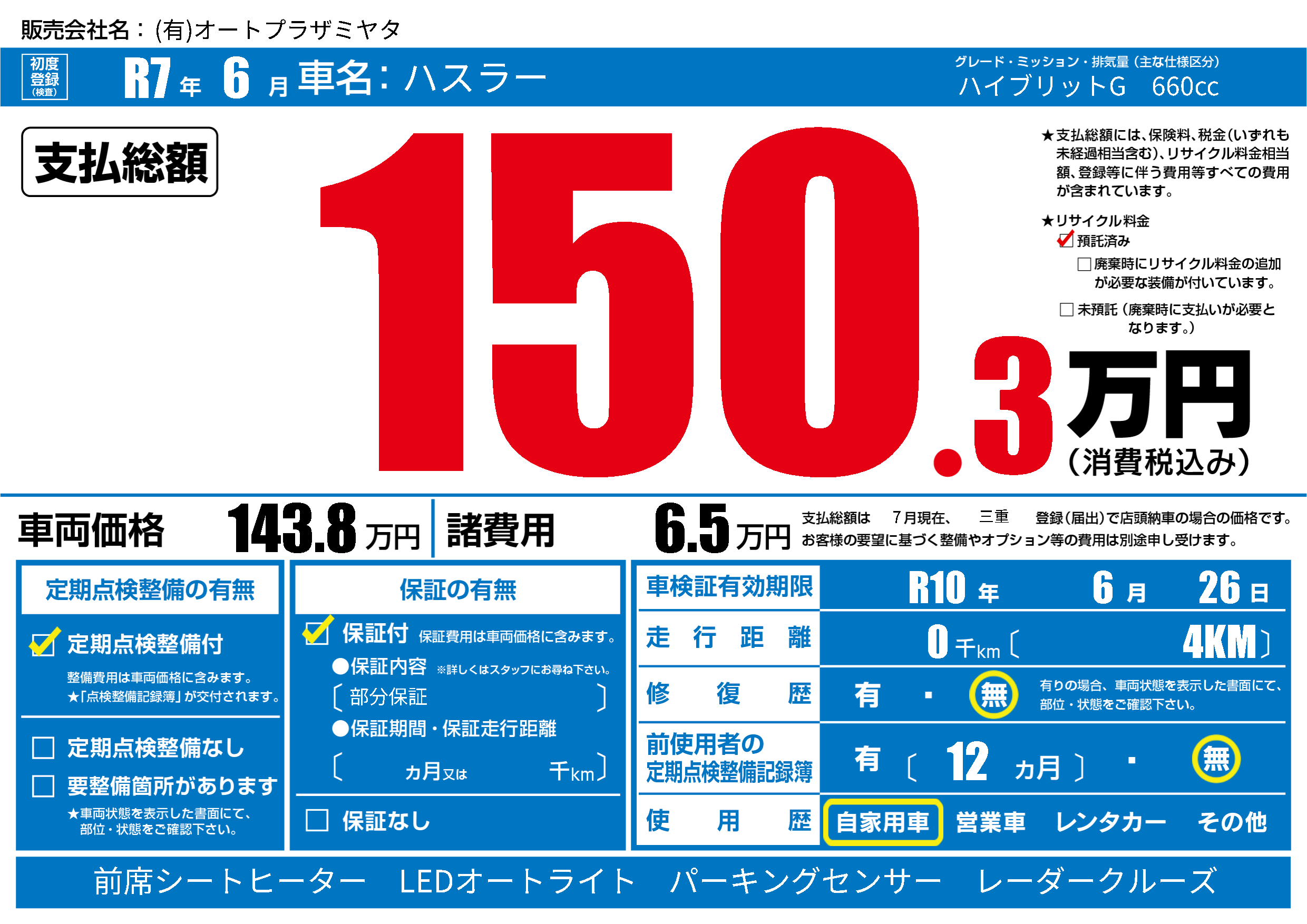 | 車名 | ハスラー | グレード ミッション 排気量 |