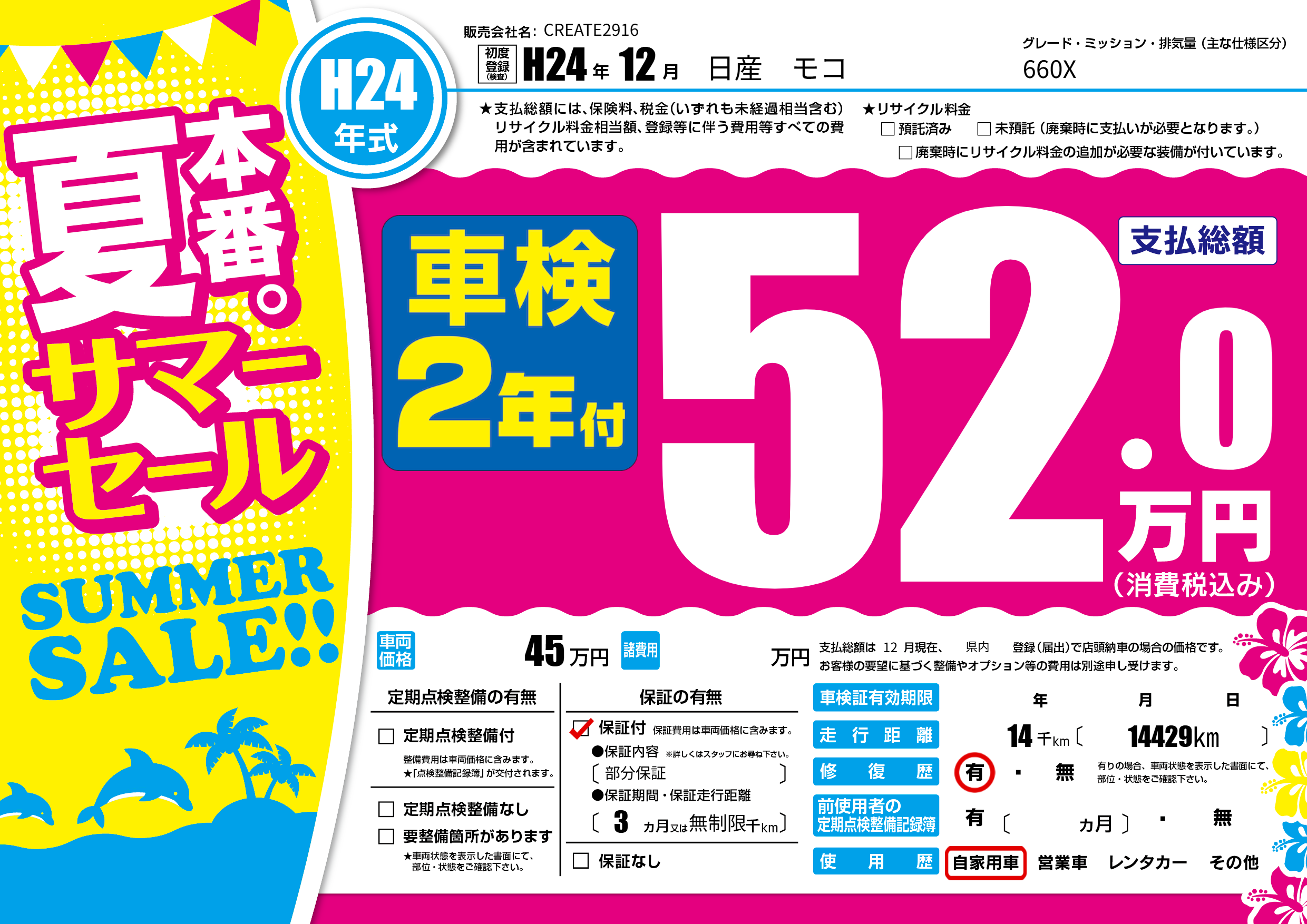 | 走行キロ | 1.4万km | 初年度登録 | H24年12月 |