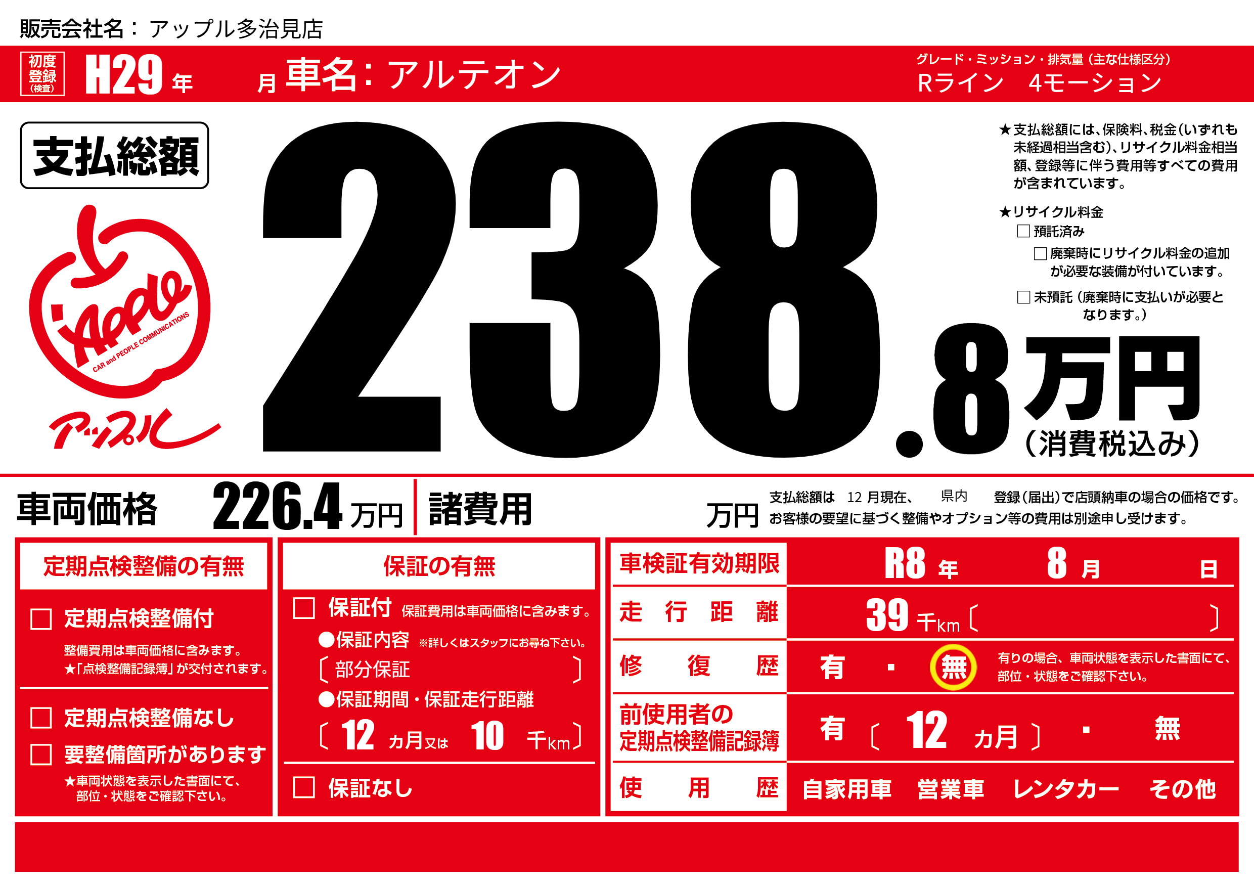 | 車検制限 | R8年 8月 - 日 | ||