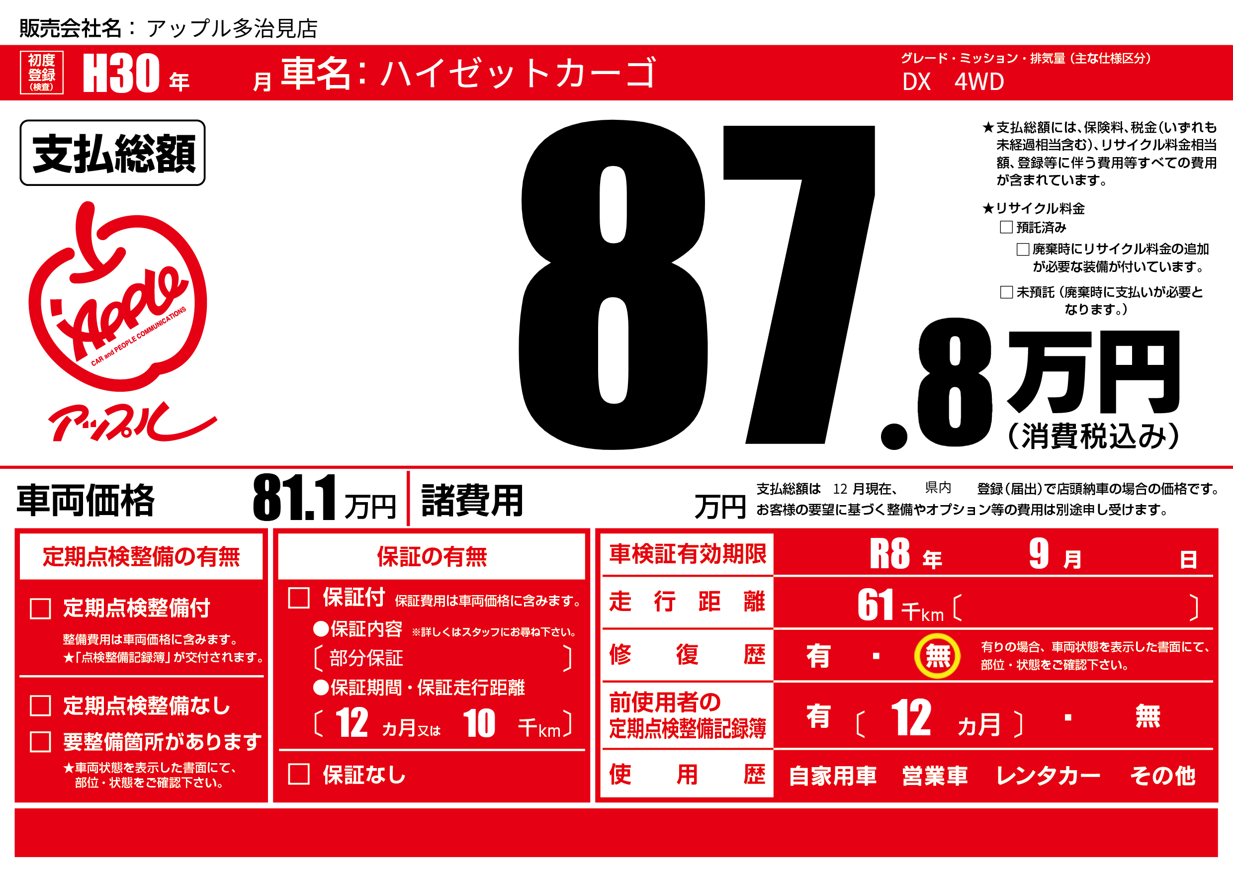 なし | 車検制限 | R8年9月---月 |