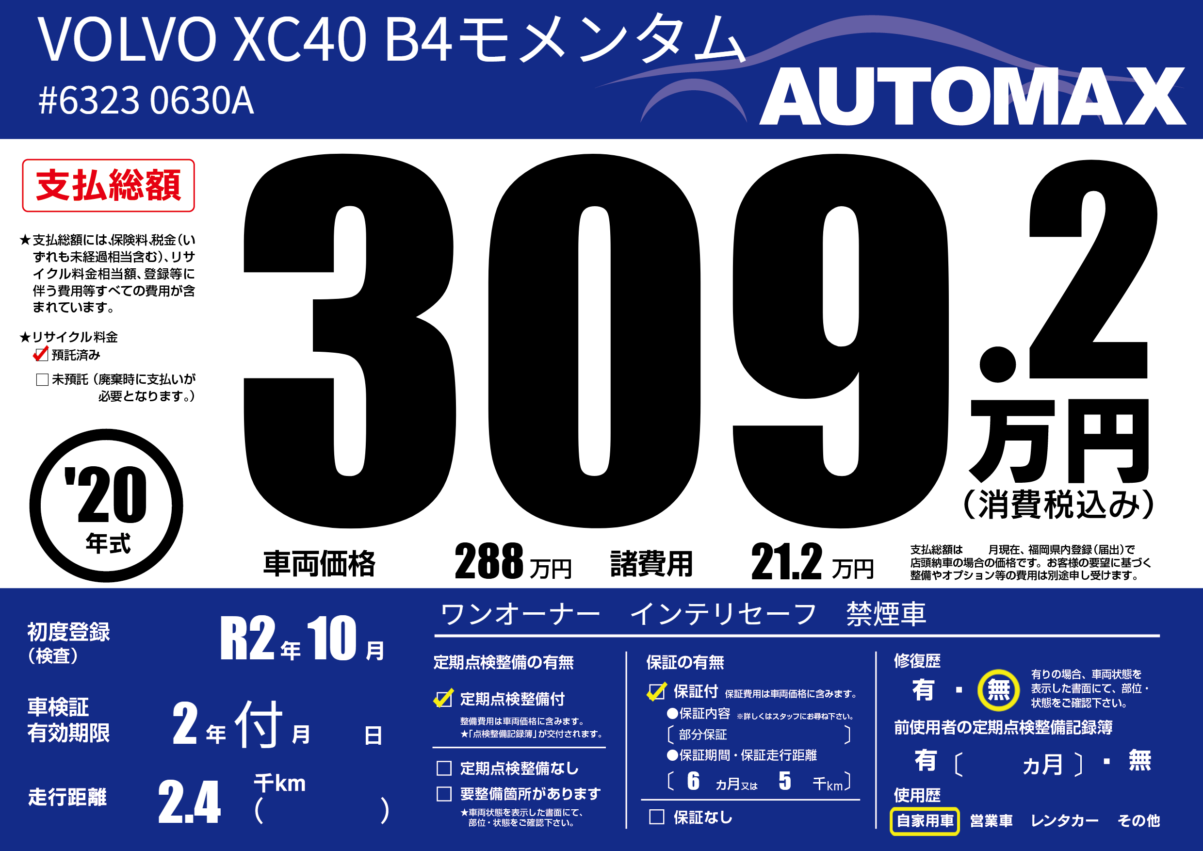 | 車名 | VOLVO XC40 B4モメンタム | グレード ミッション 排気量 |