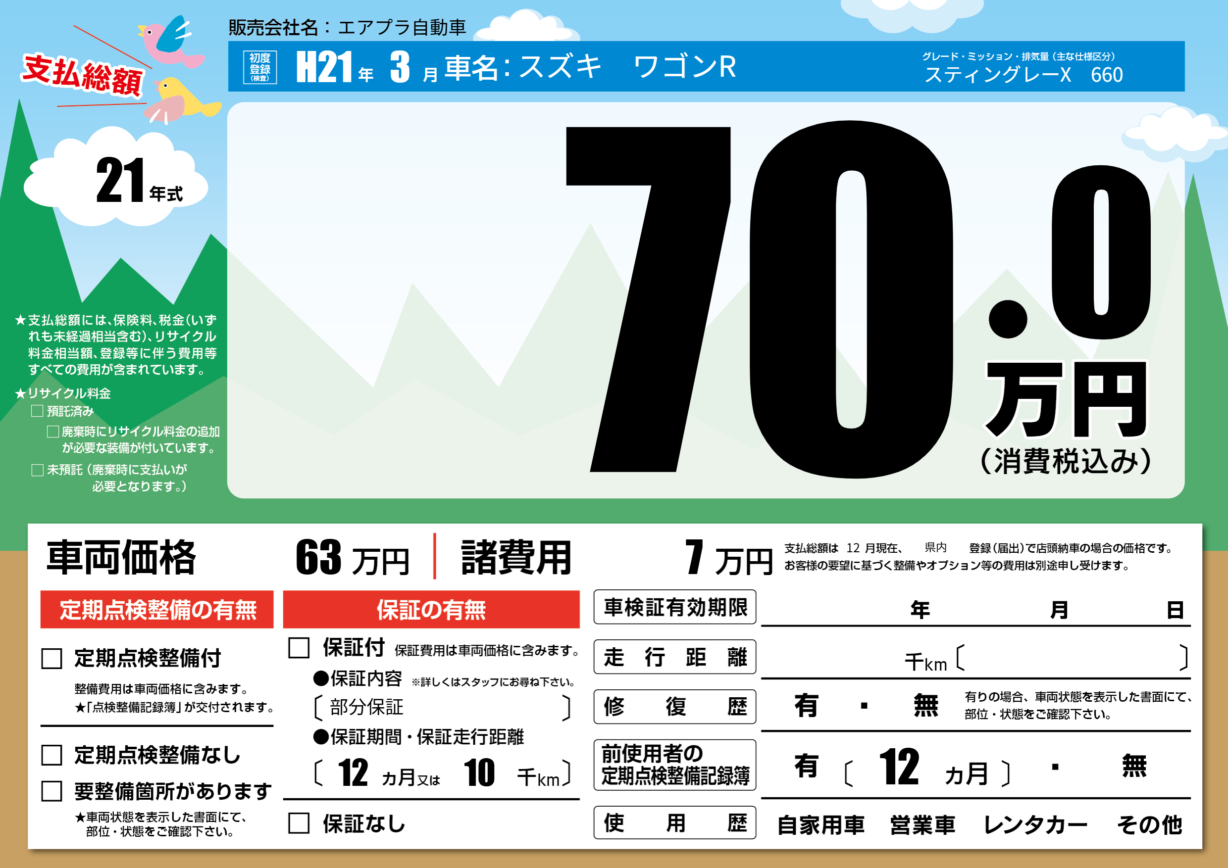 | 車名 | スズキ ワゴンR | グレード ミッション 排気量 |