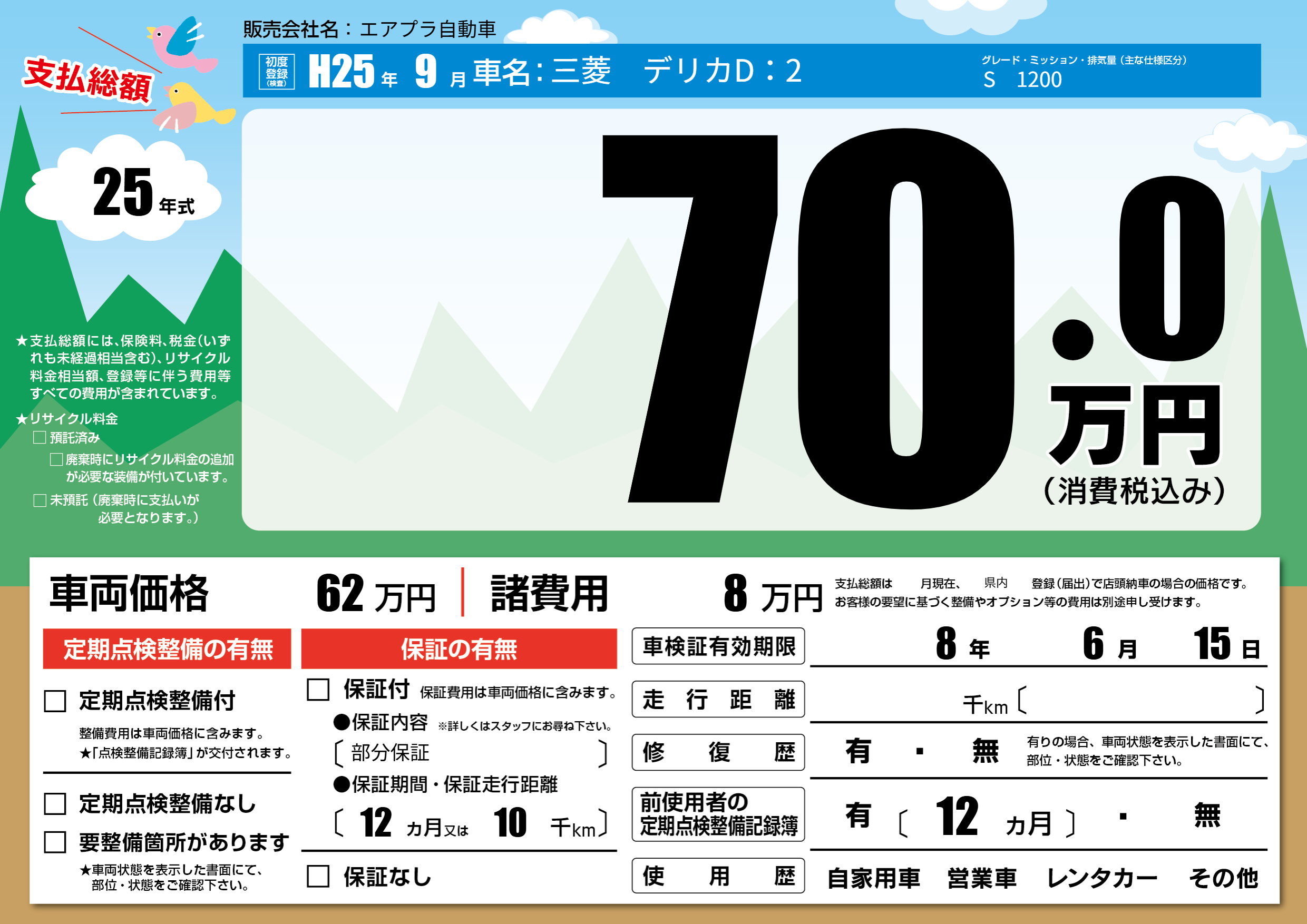 | 車名 | 三菱 デリカD:2 | グレード ミッション 排気量 |