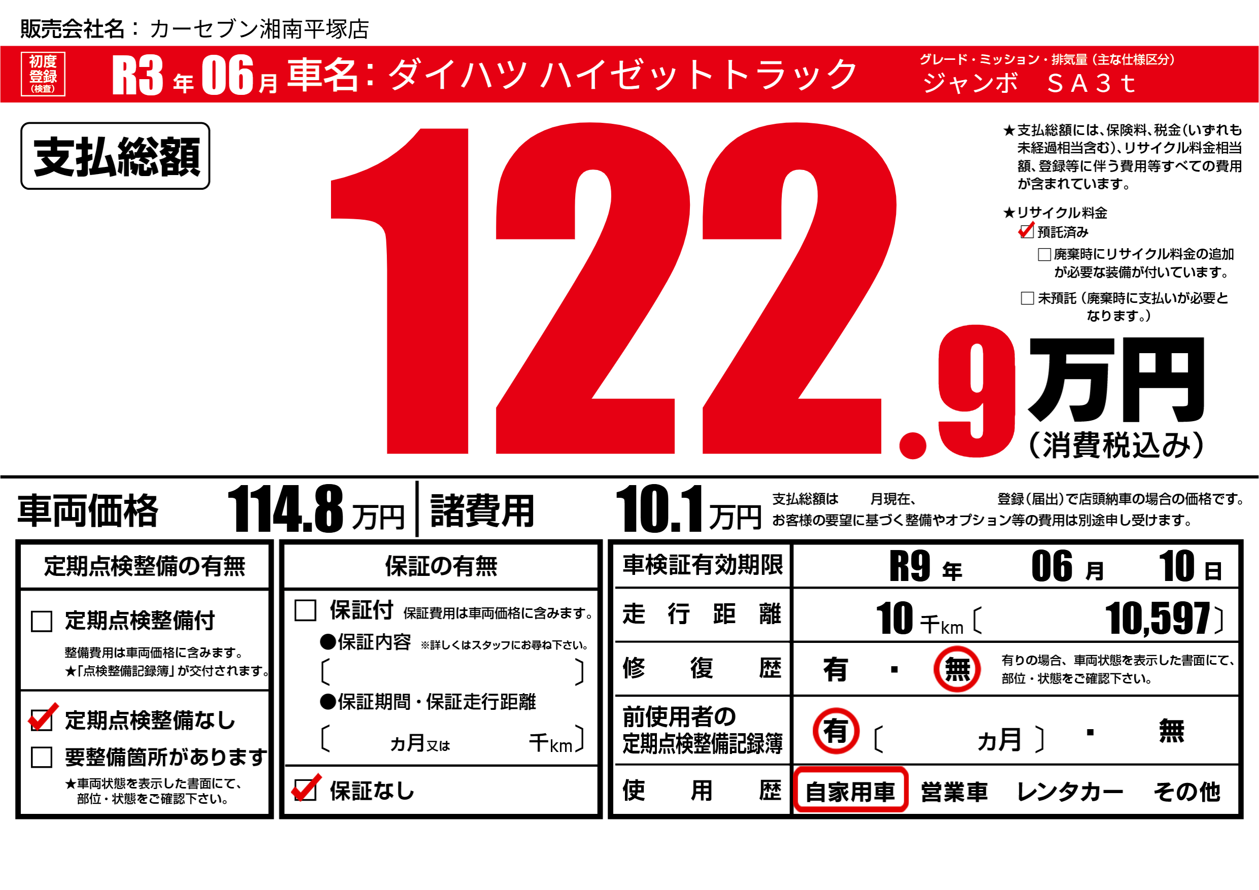 | 走行キロ | 1万km | 初年度登録 | R3年06月 |