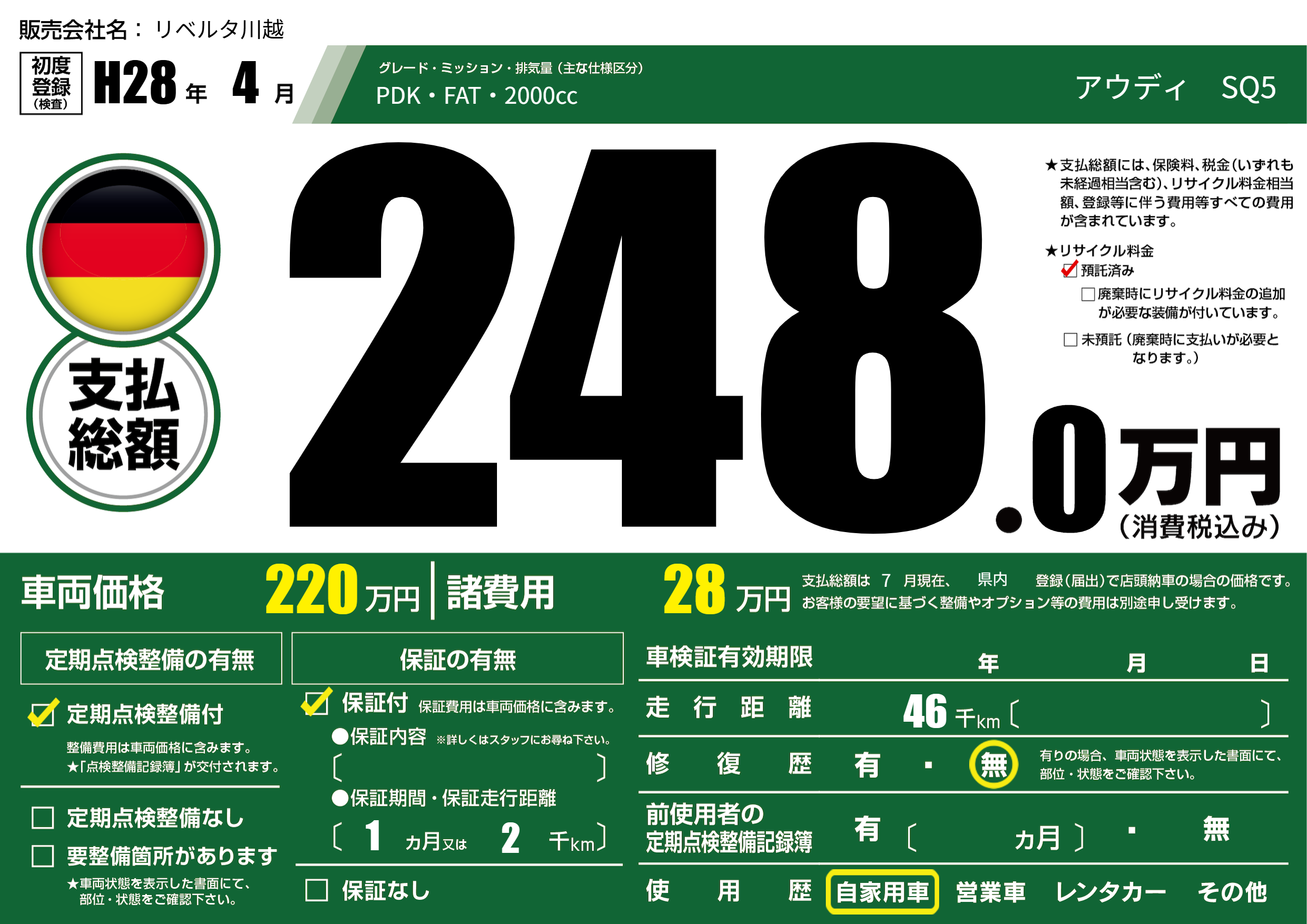 | 車名 | アウディ SQ5 | グレード ミッション 排気量 |