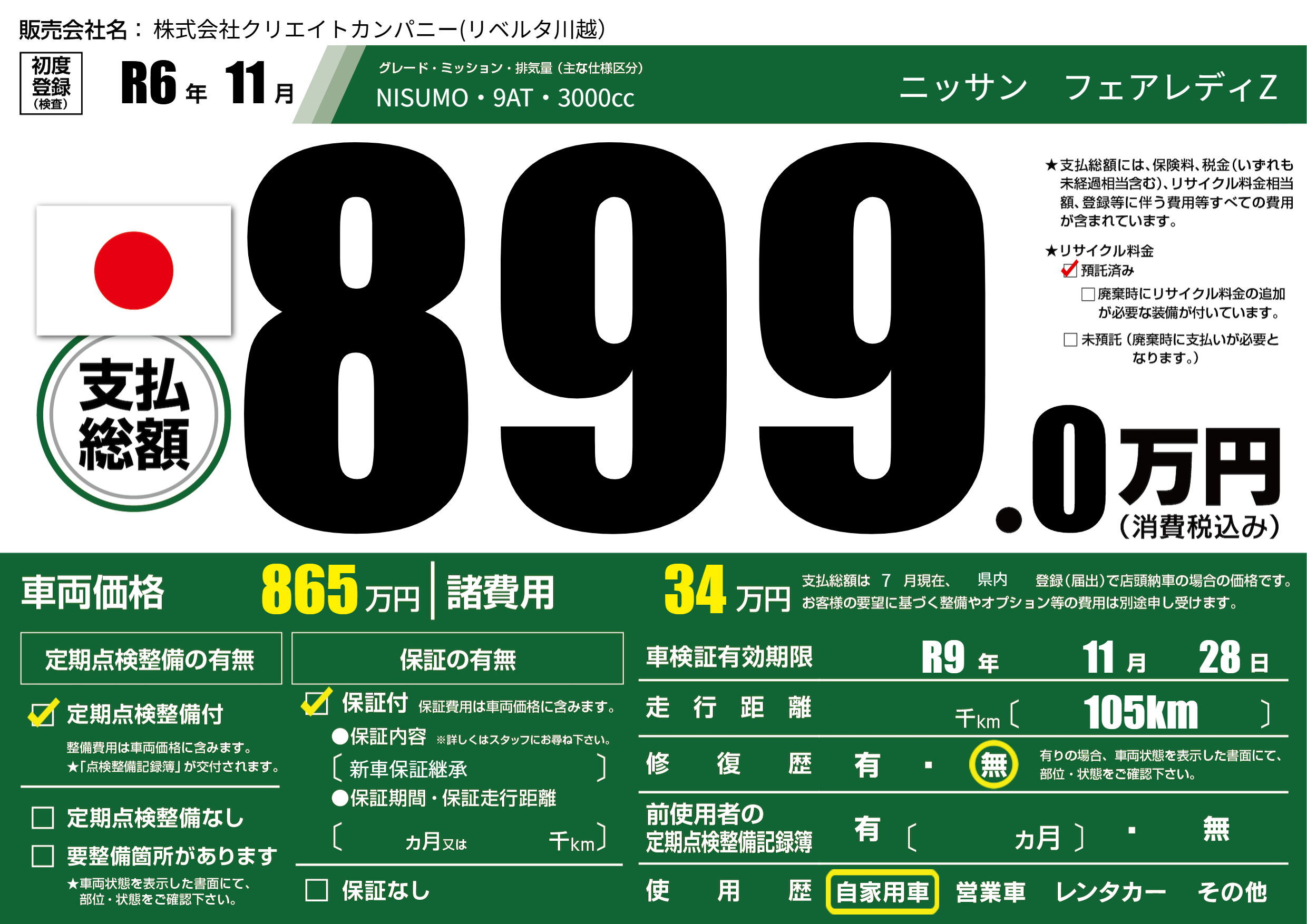 | 車名 | ニッサン フェアレディZ | グレード ミッション 排気量 |