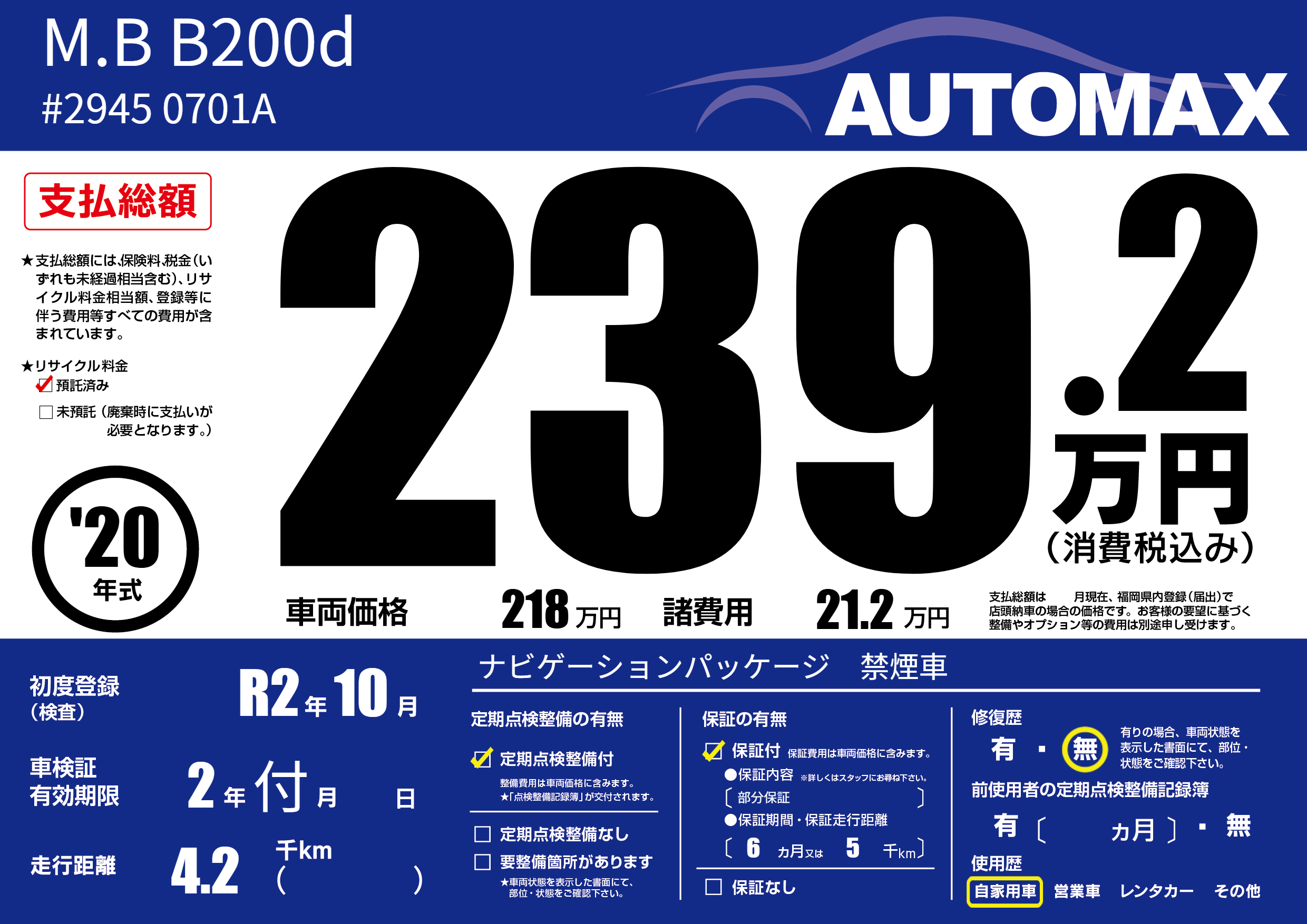 | 車名 | M.B B200d | グレード ミッション 排気量 |