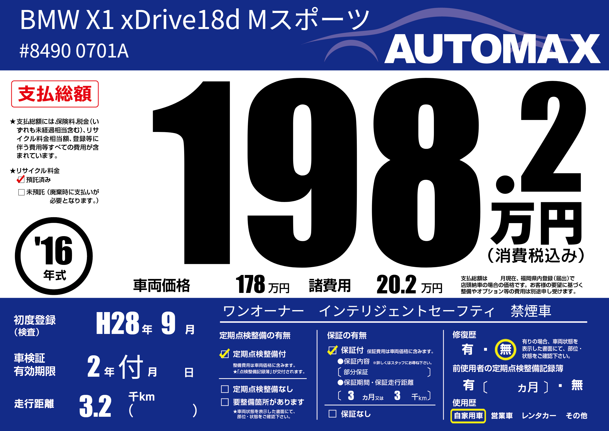 | 車名 | BMW X1 xDrive18d Mスポーツ | グレード ミッション 排気量 |