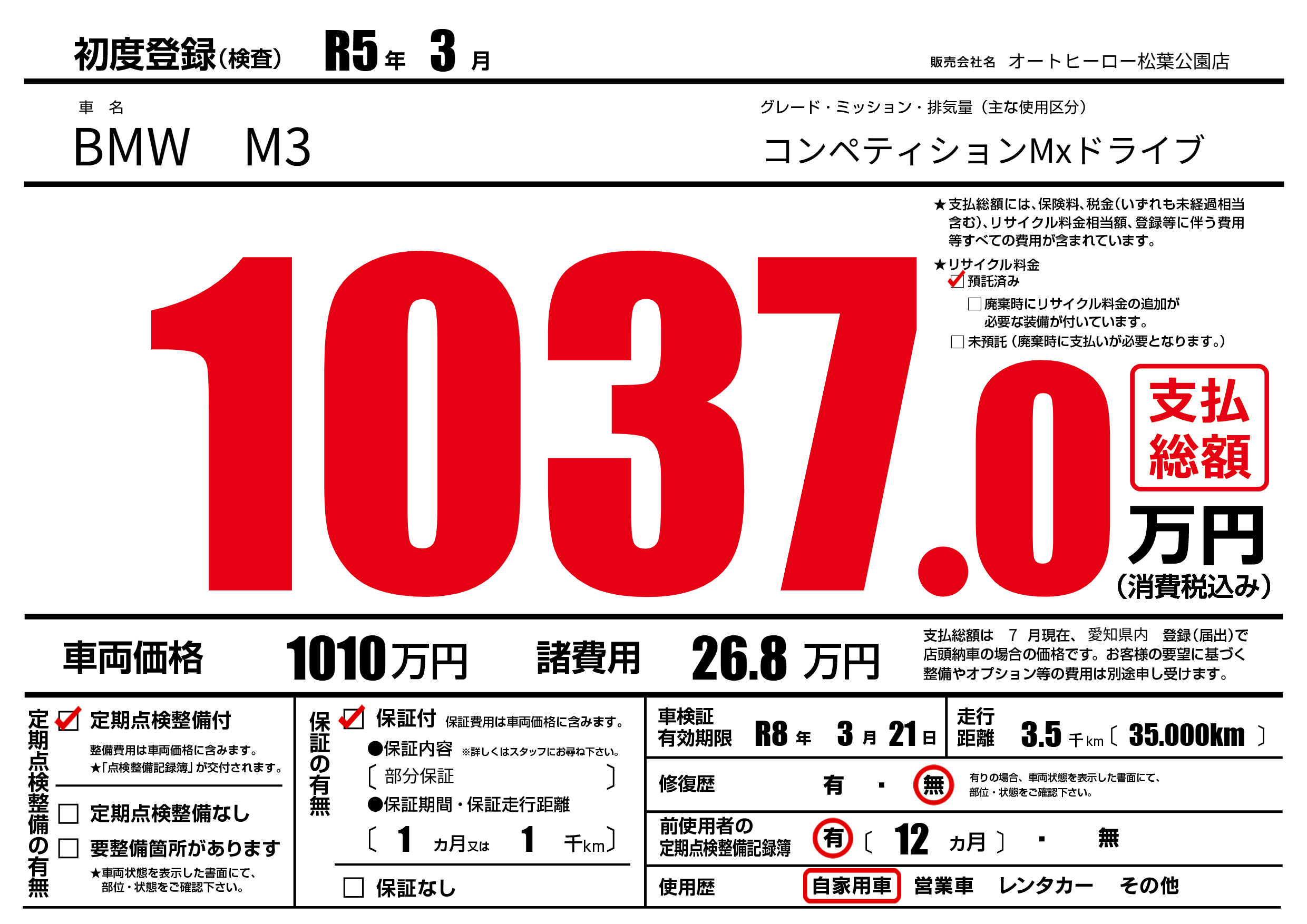 | 車名 | BMW M3 | グレード ミッション 排気量 |