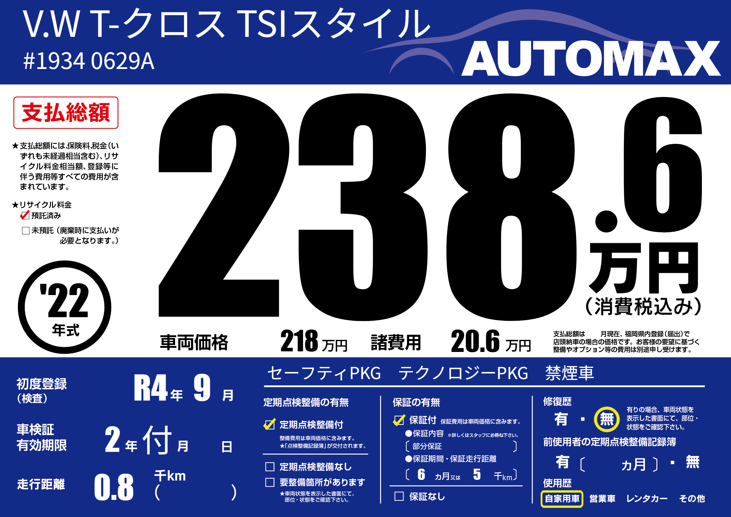 | 車名 | V.W T-クロス TSIスタイル | グレード ミッション 排気量 |