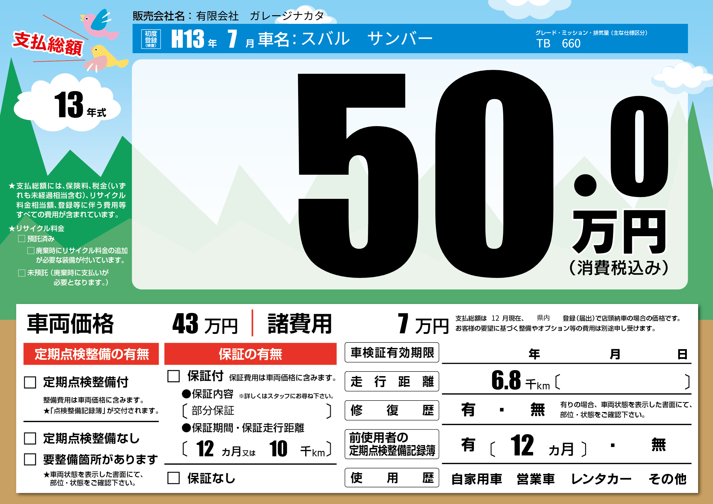 | 走行キロ | 0.6万km | 初年度登録 | H13年7月 |