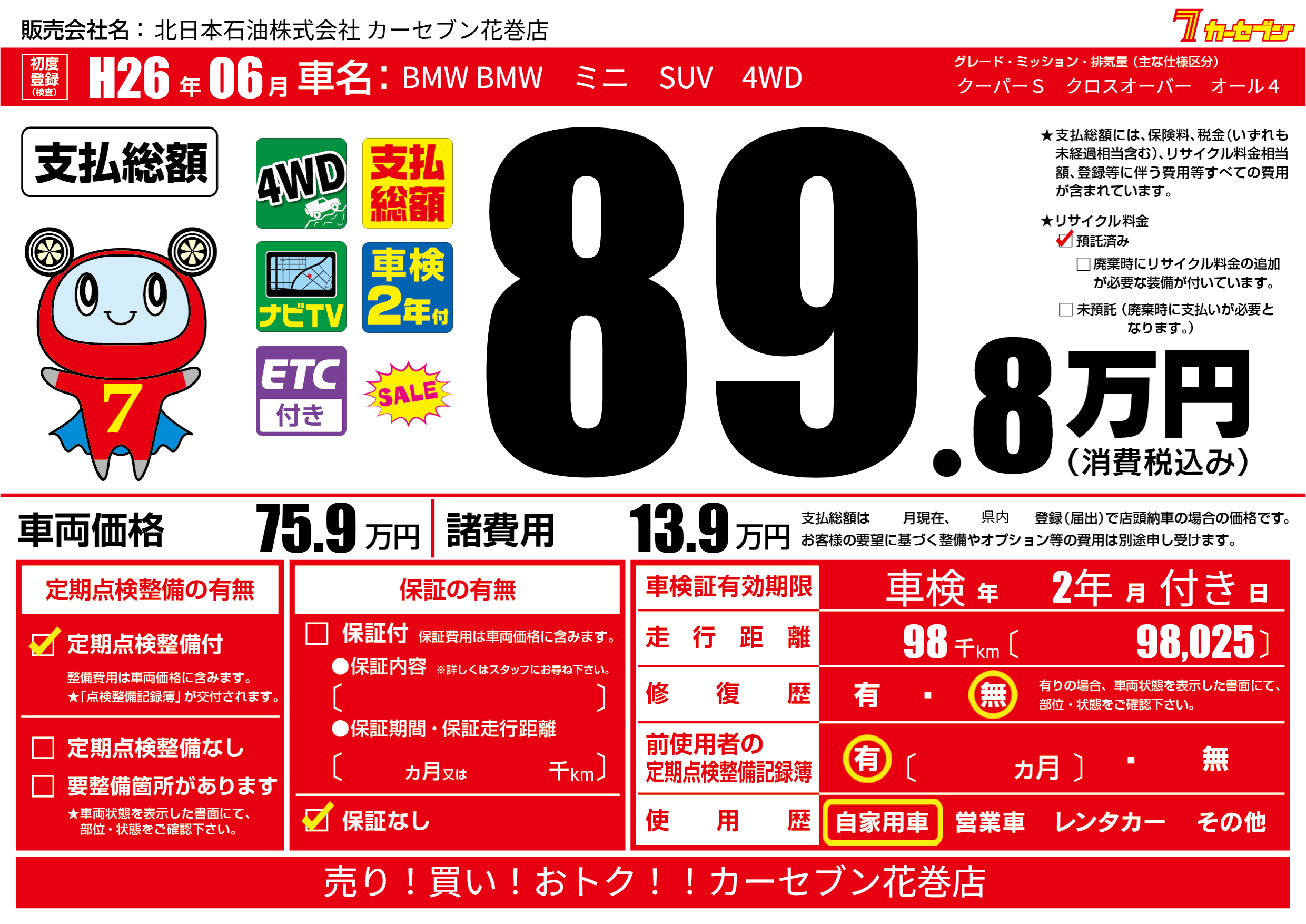 | 車名 | BMW BMW ミニ SUV 4WD | グレード ミッション 排気量 |