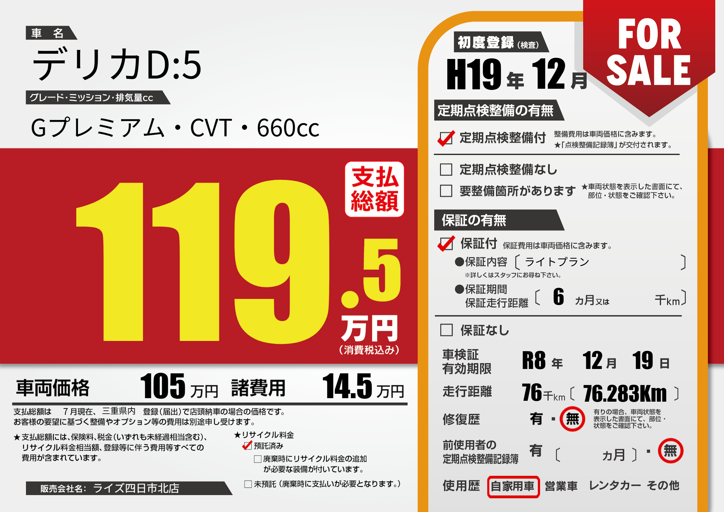 | 車名 | デリカD:5 | グレード ミッション 排気量 |