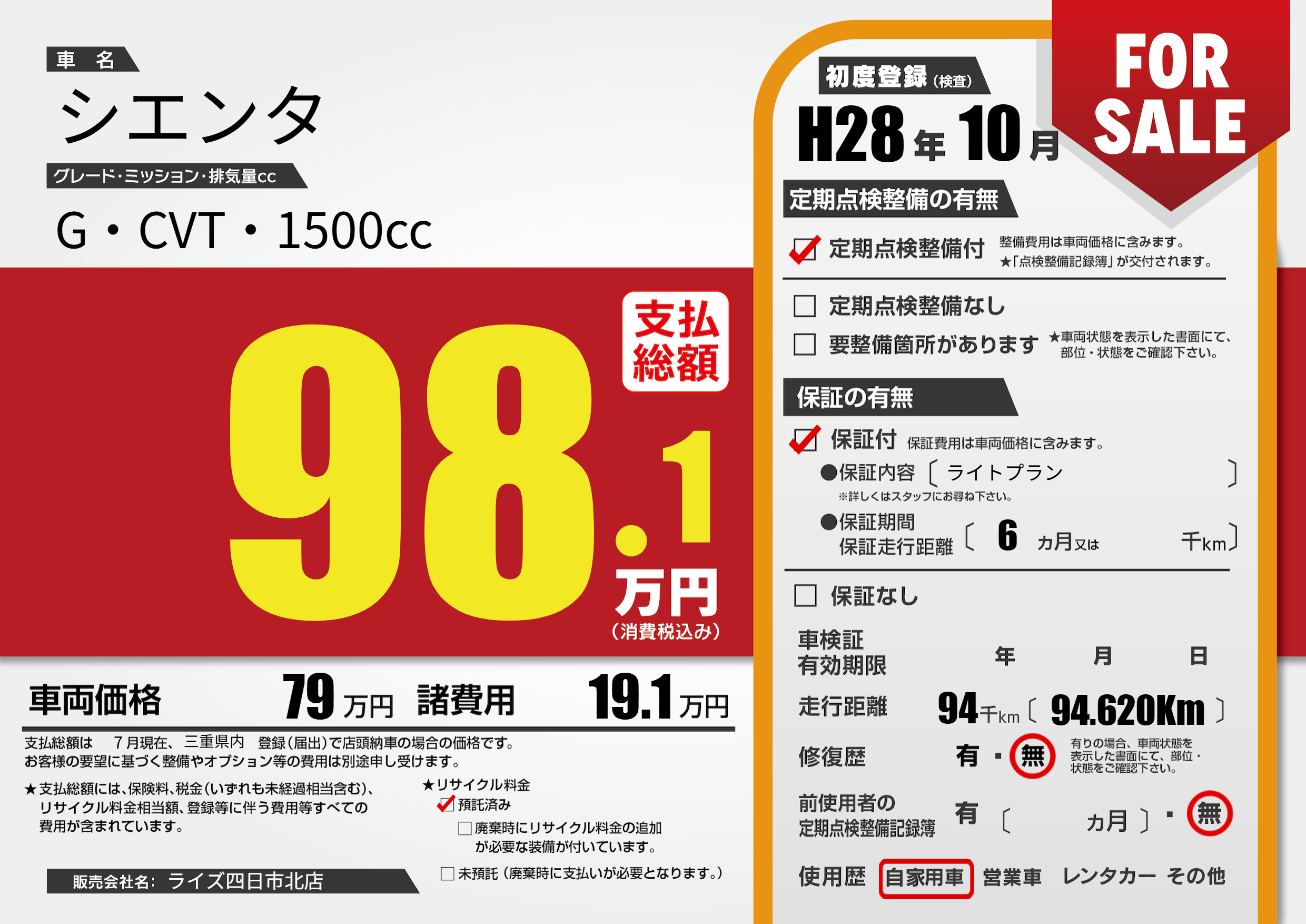 | 車名 | シエンタ | グレード ミッション 排気量 |