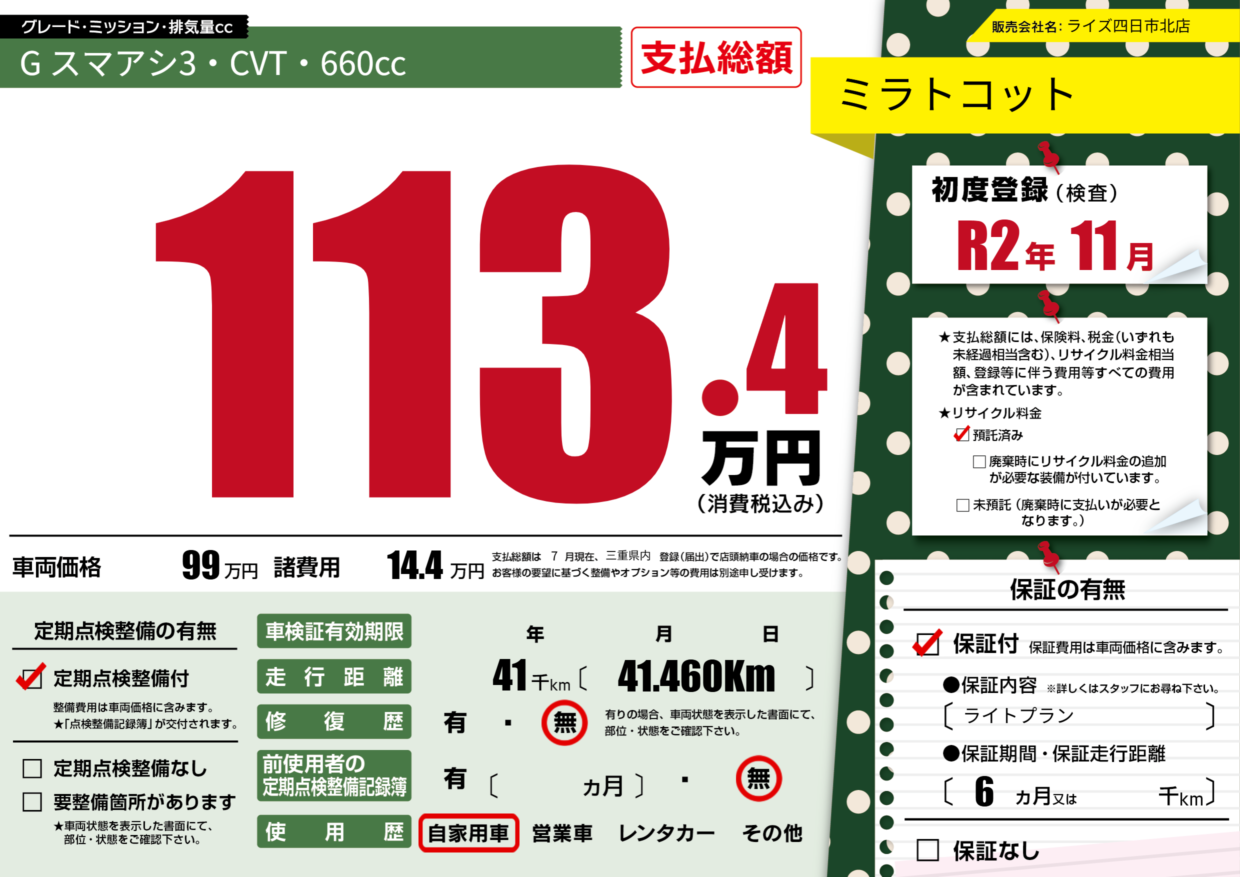 保証付き 保証内容(ライトプラン) 6ヶ月または千km |