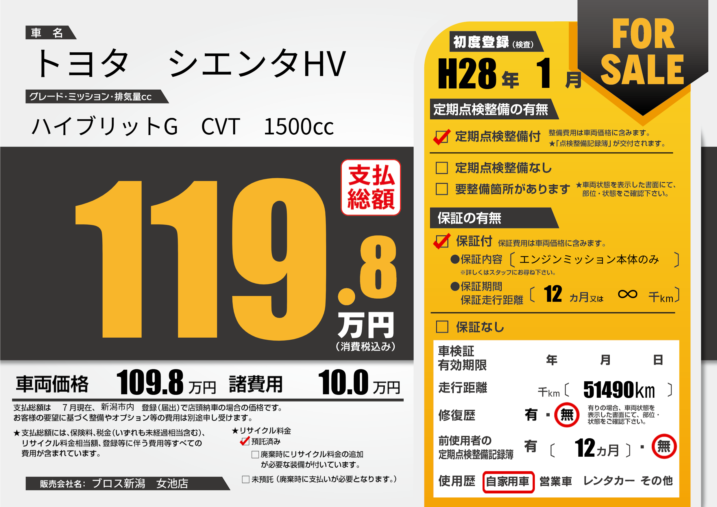 | 車名 | トヨタ シエンタHV | グレード ミッション 排気量 |