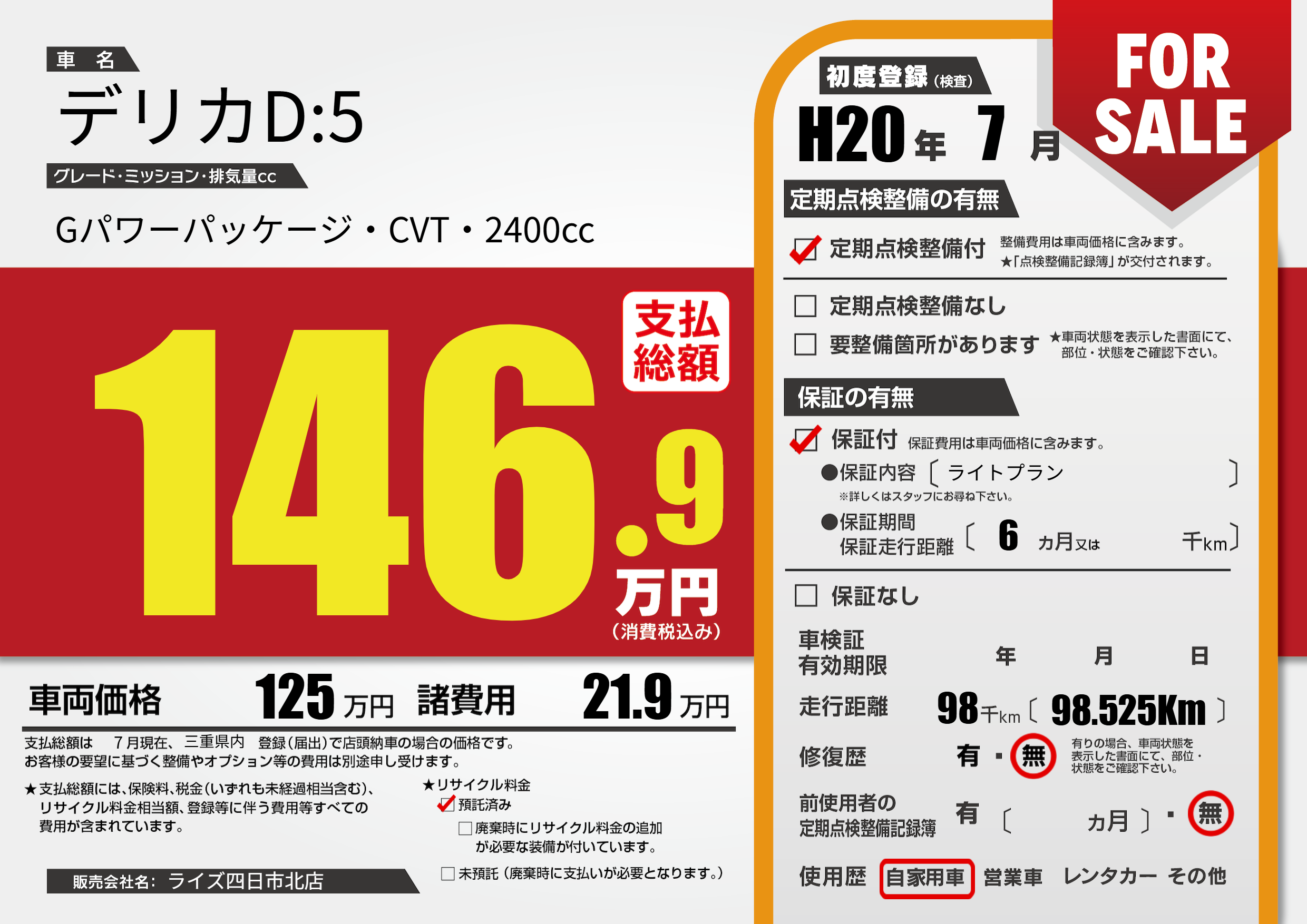 | 車名 | デリカD:5 | グレード ミッション 排気量 |