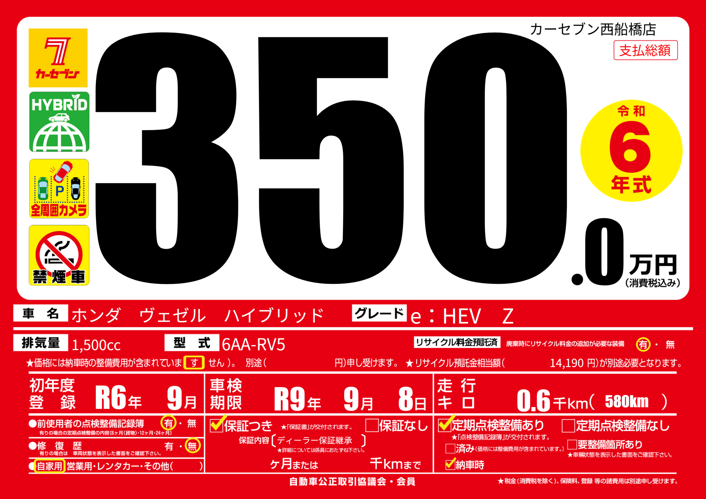 | 走行キロ | - | 初年度登録 | R6年9月 |
