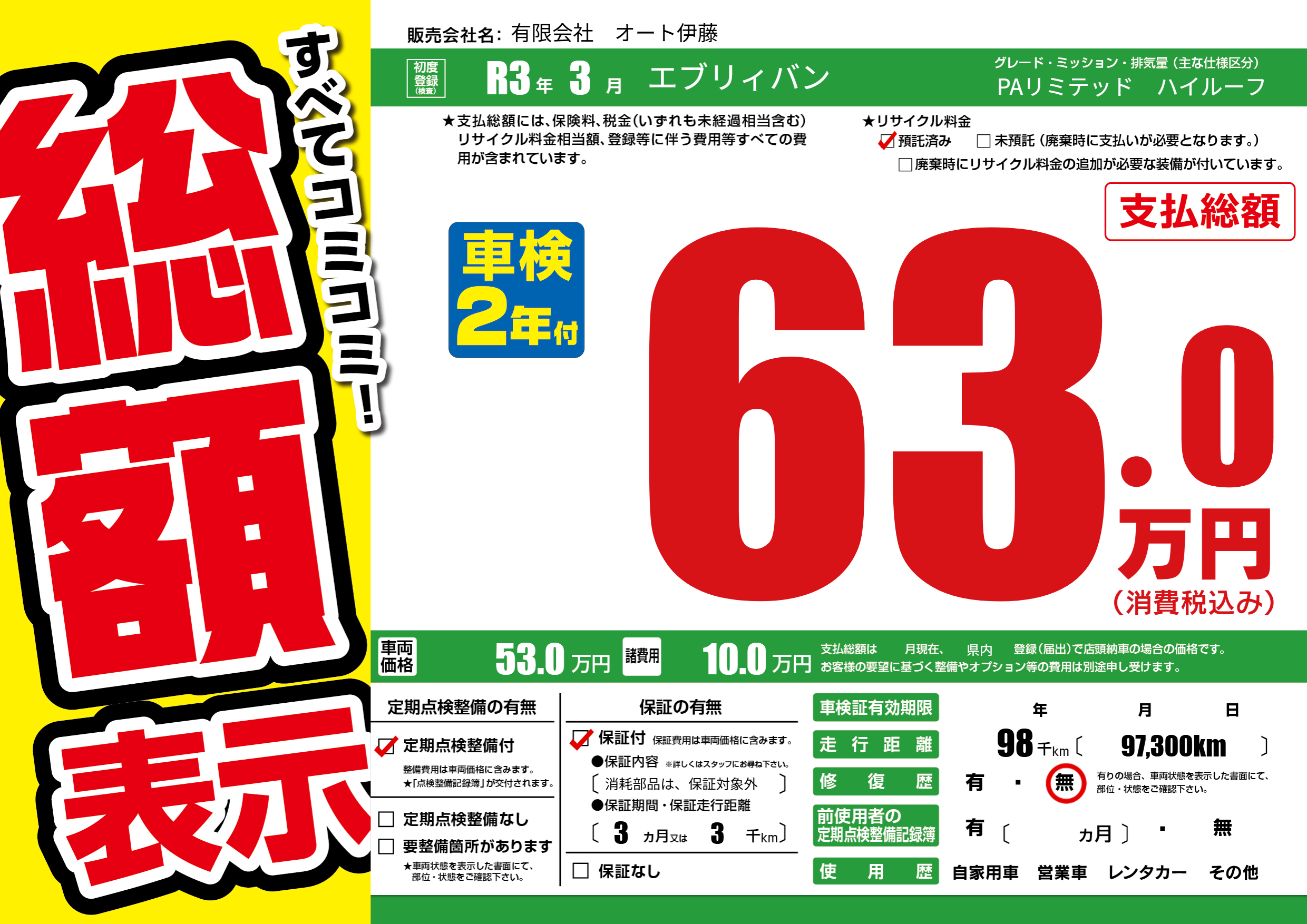 保証付き 保証内容(消耗部品は、保証対象外) 3ヶ月または(3)千kmまで |