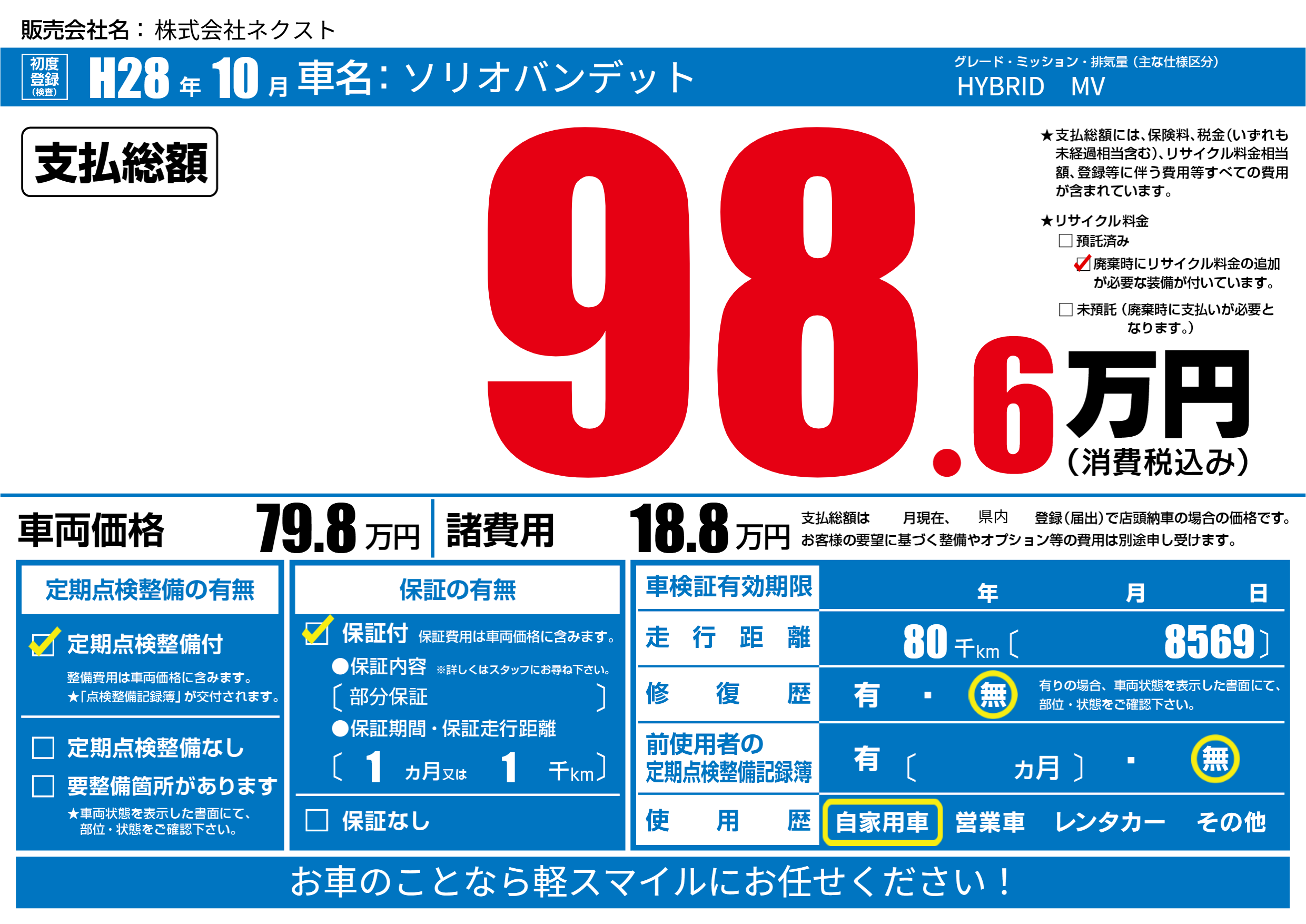 | 走行キロ | 8万km | 初年度登録 | H28年10月 |