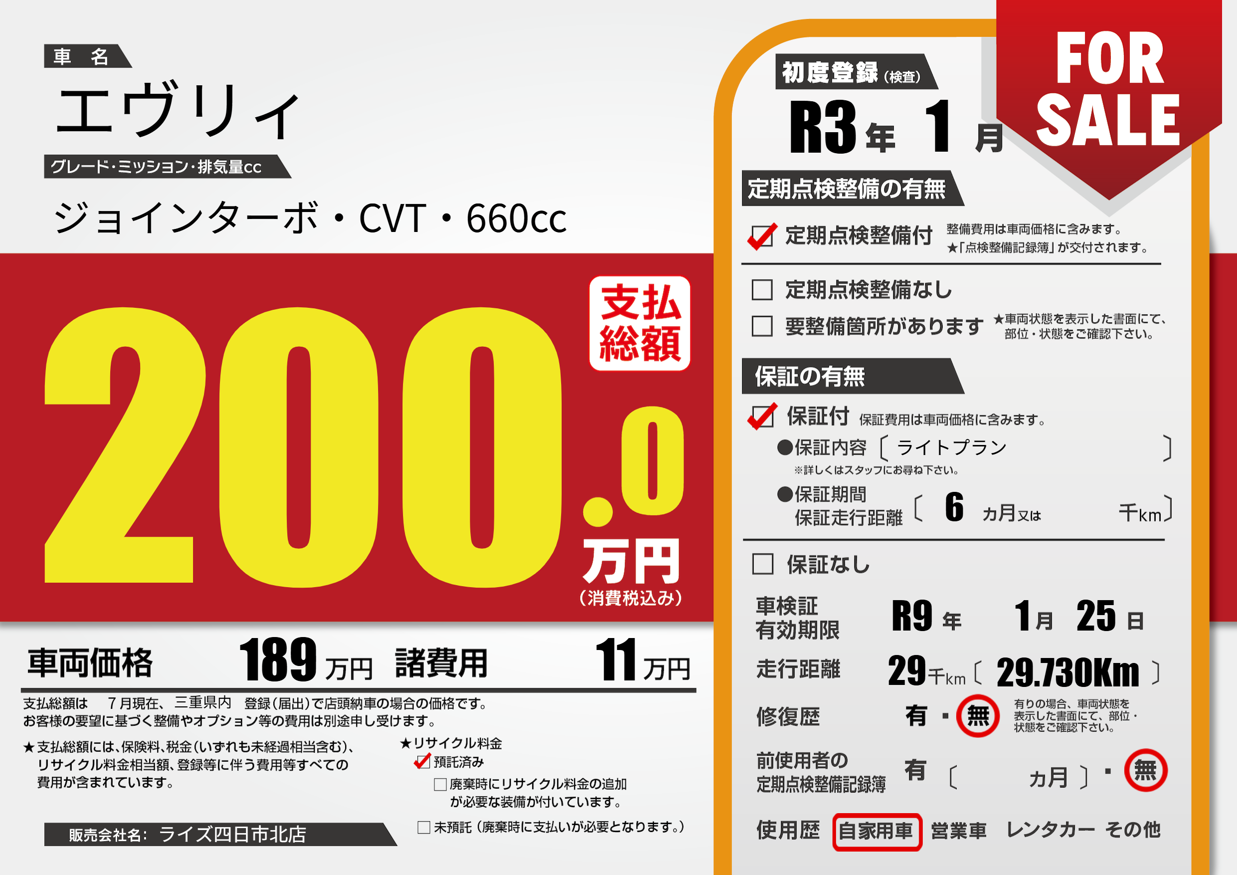 | 車名 | エヴリィ | グレード ミッション 排気量 |