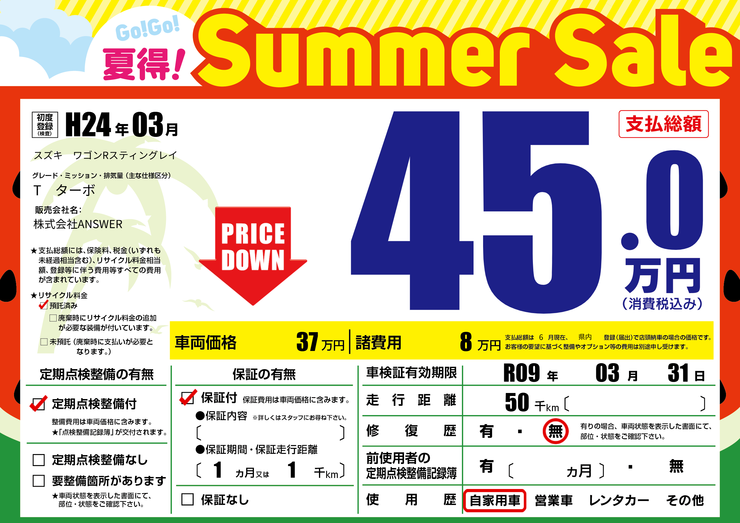 | 走行キロ | 5万km | 初年度登録 | H24年03月 |
