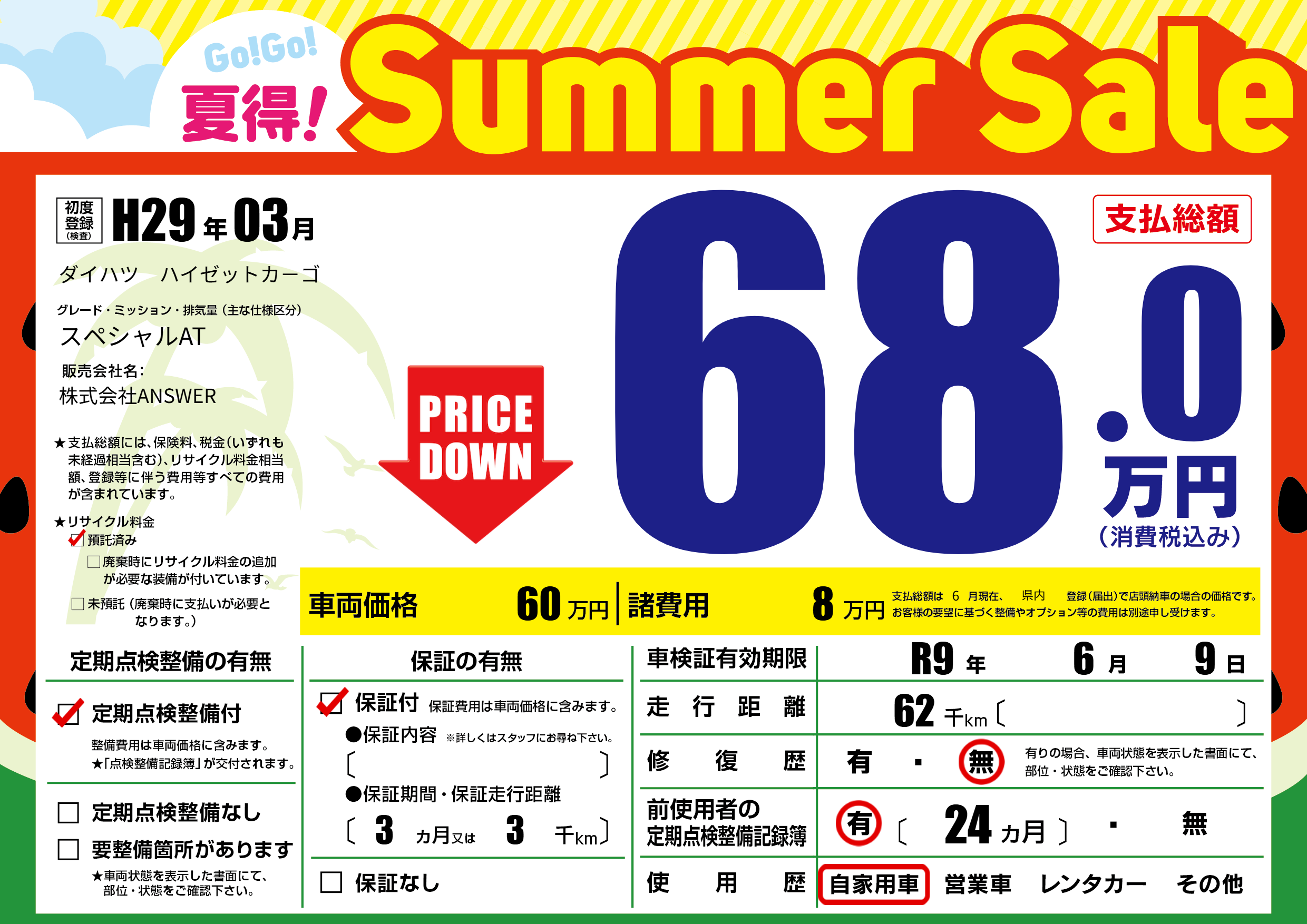 | 走行キロ | 6.2万km | 初年度登録 | H29年03月 |