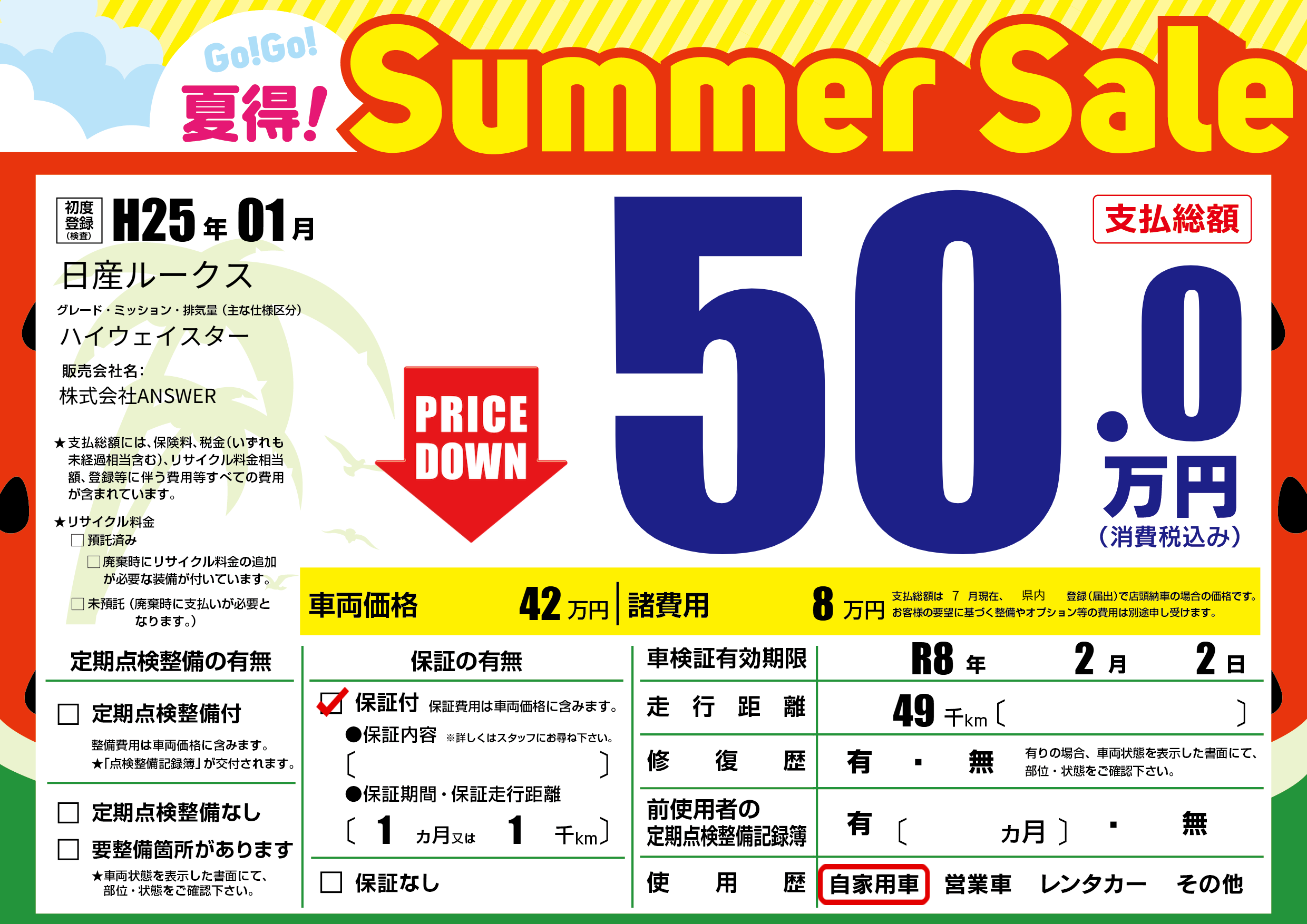| 走行キロ | 4.9万km | 初年度登録 | H25年01月 |