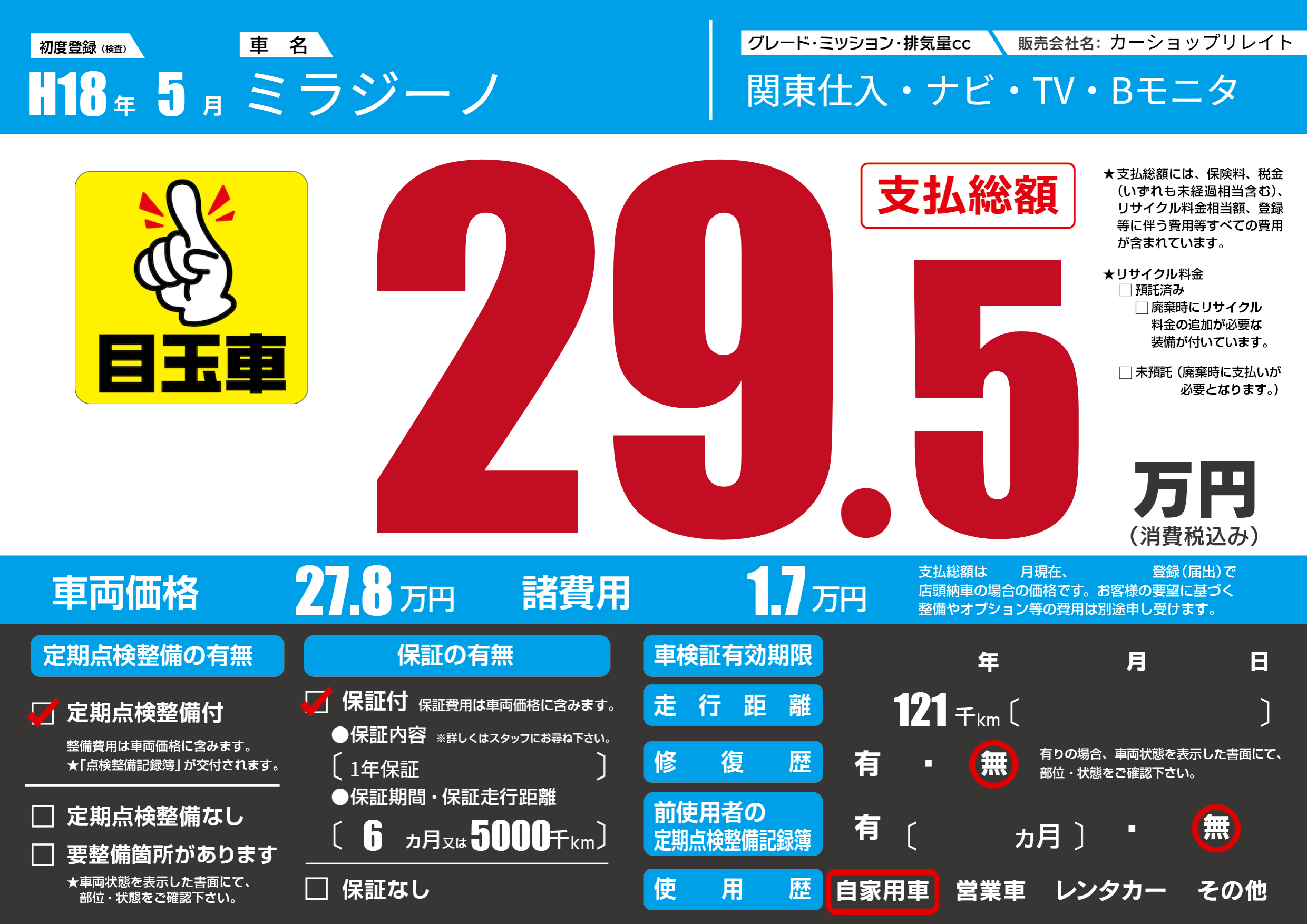 | 走行キロ | 12.1万km | 初年度登録 | H18年5月 |