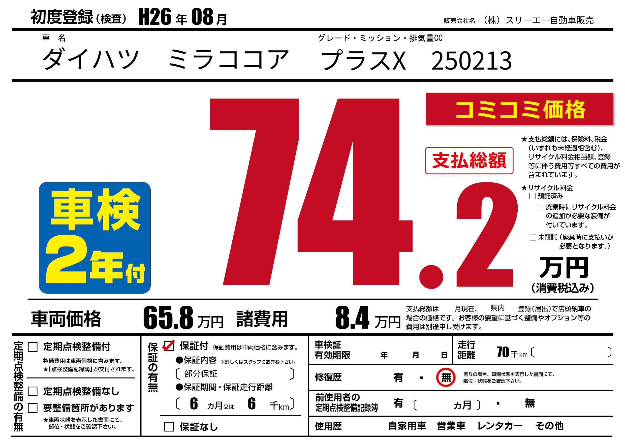 | 走行キロ | 7万km | 初年度登録 | H26年08月 |