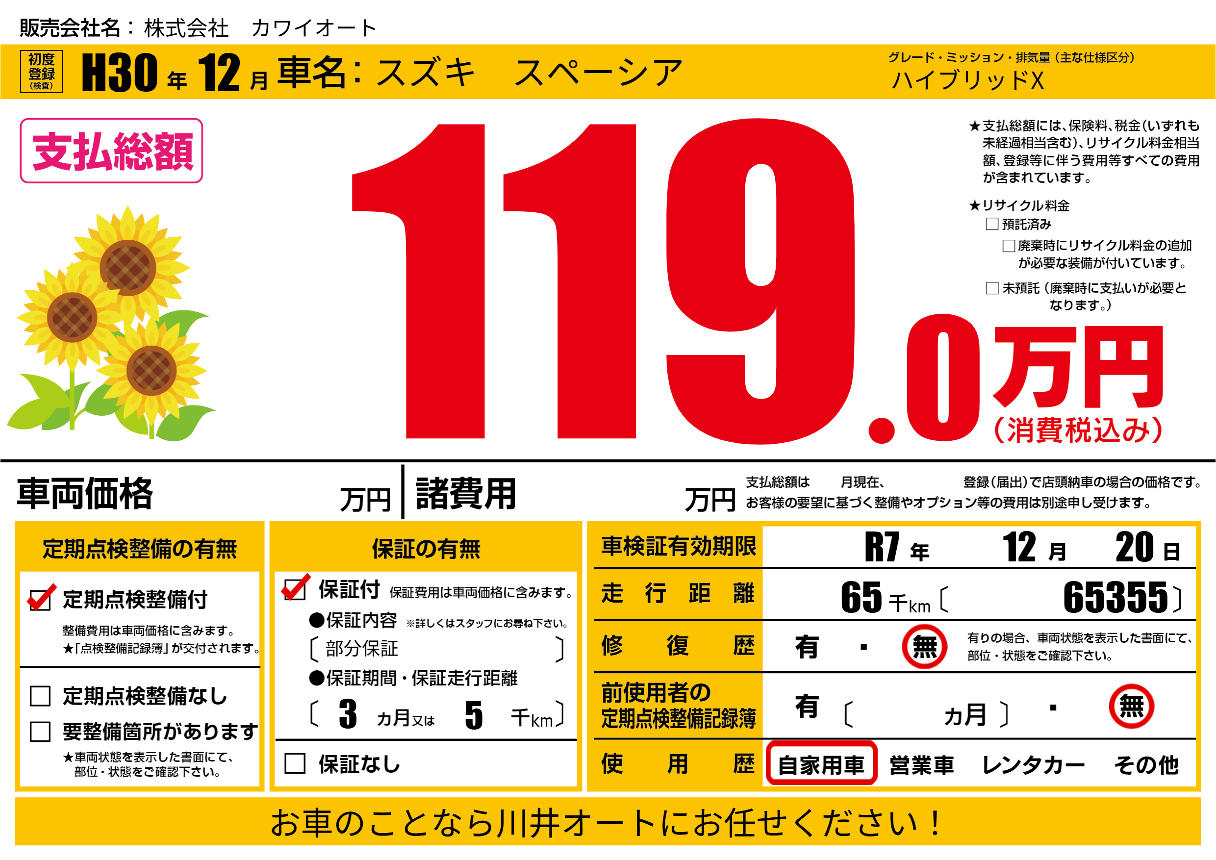 | 走行キロ | 6.5万km | 初年度登録 | H30年12月 |