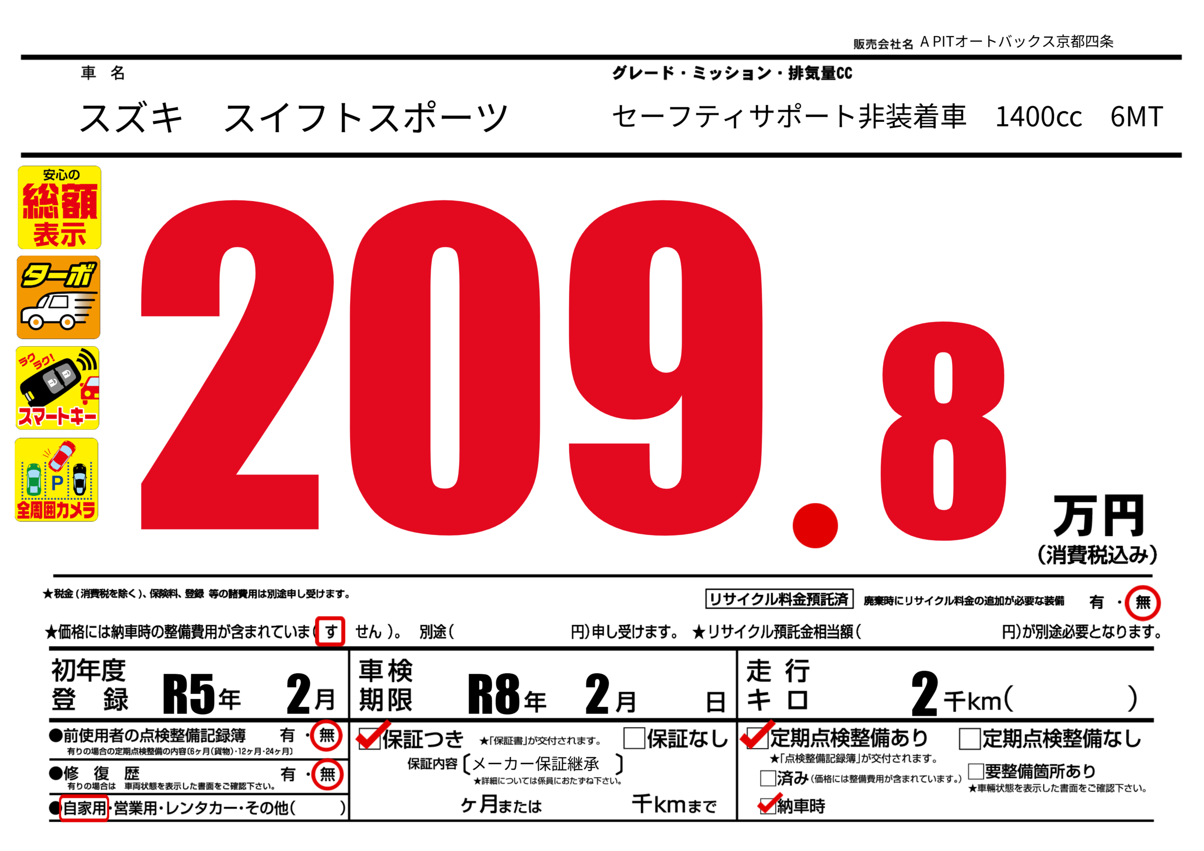 | 車名 | スズキ スイフトスポーツ | グレード ミッション 排気量 |