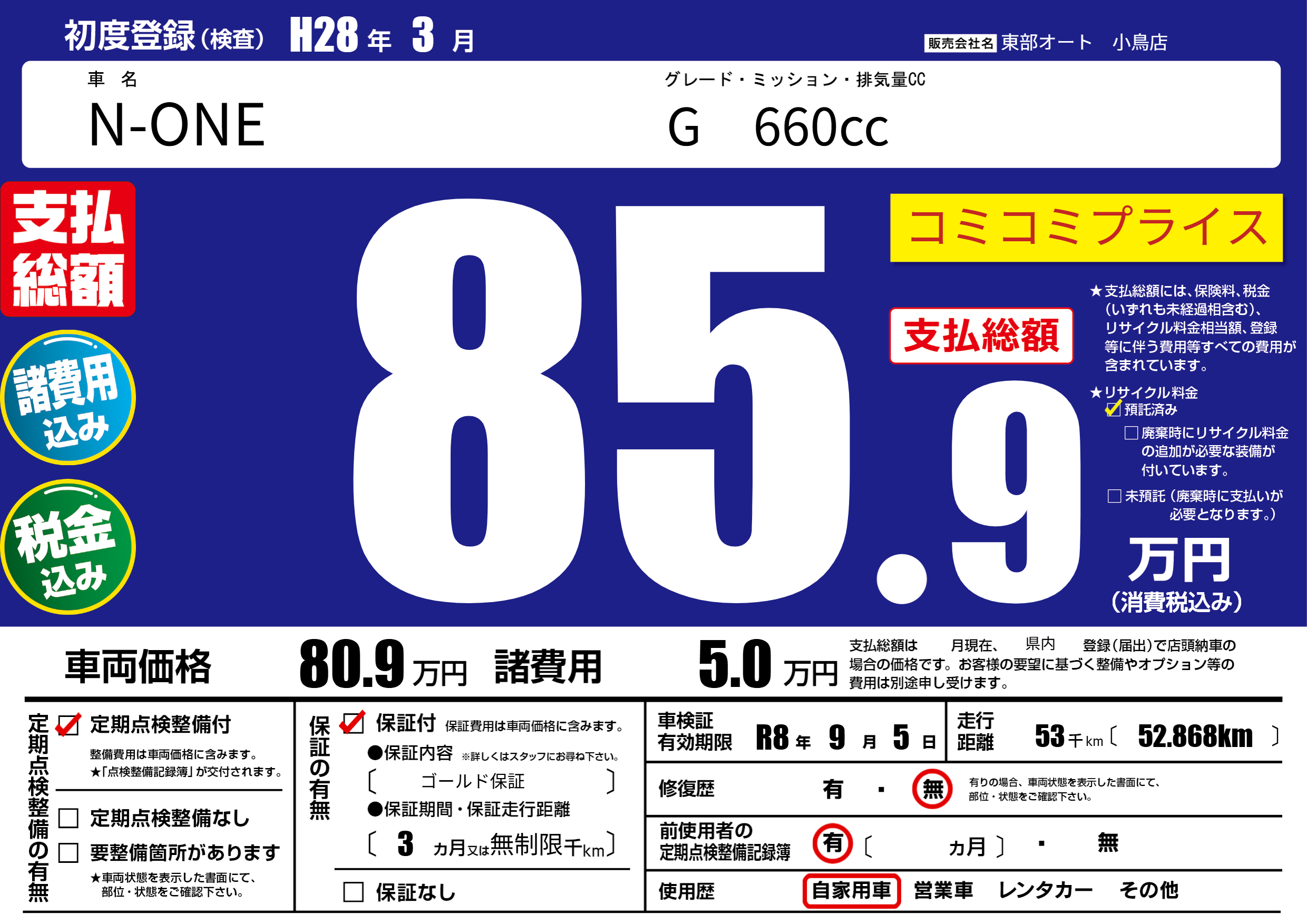 | 車名 | N-ONE | グレード ミッション 排気量 |