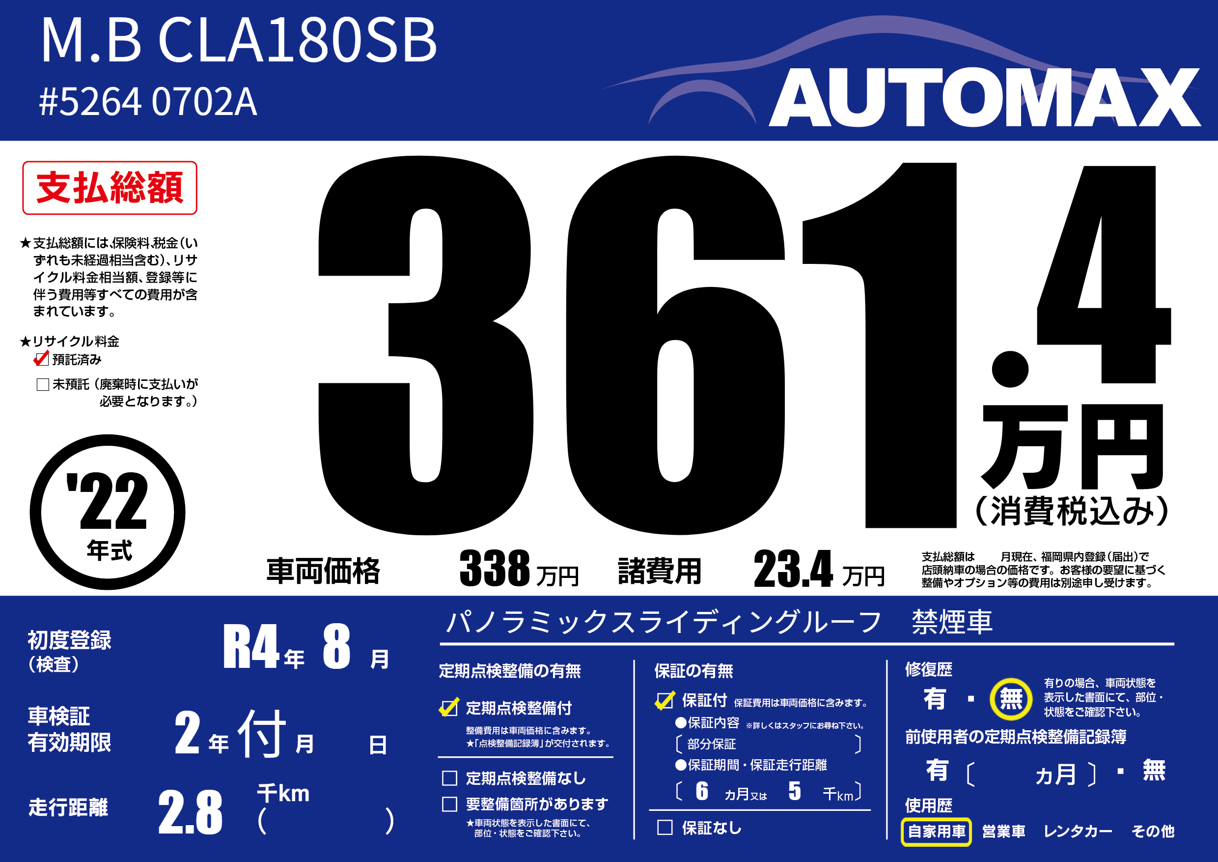 | 車名 | M.B CLA180SB | グレード ミッション 排気量 |