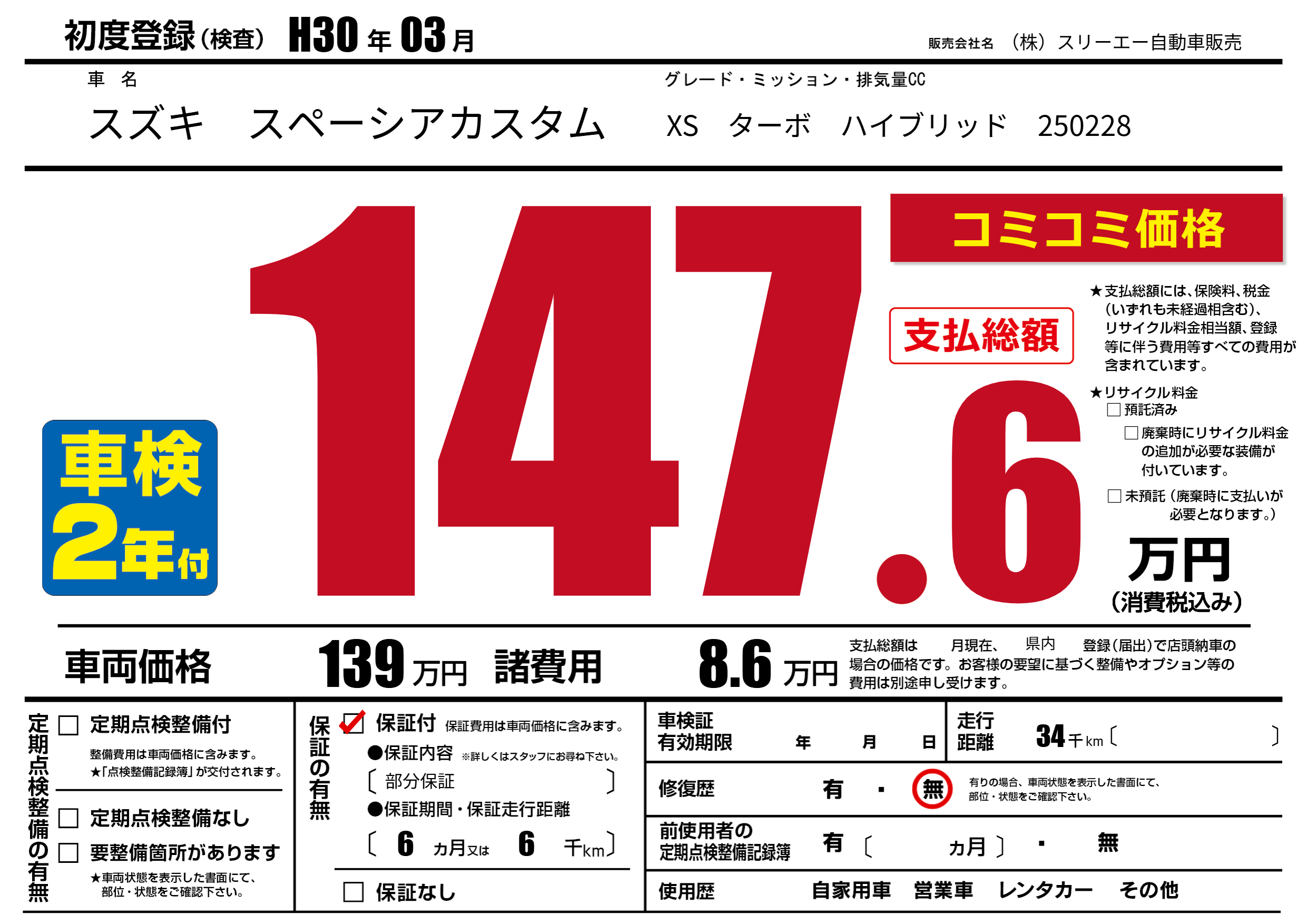保証付き 保証内容(部分保証) 6ヶ月または(6)千kmまで |