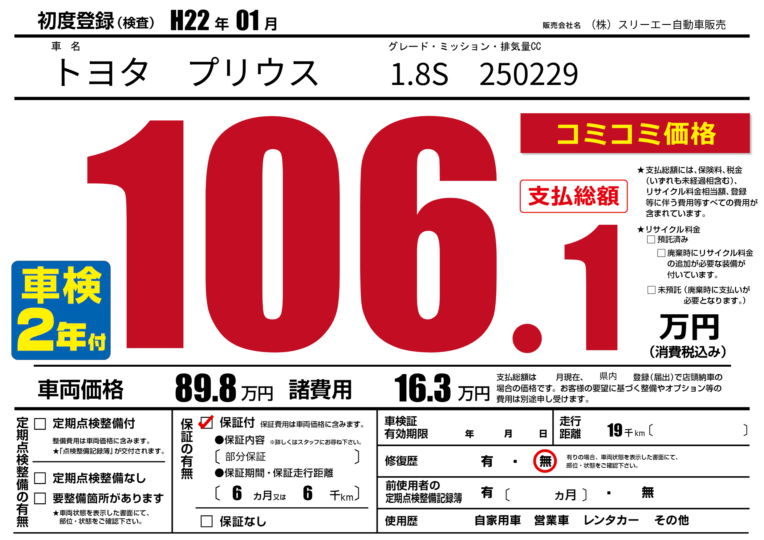 | 車名 | トヨタ プリウス | グレード ミッション 排気量 |