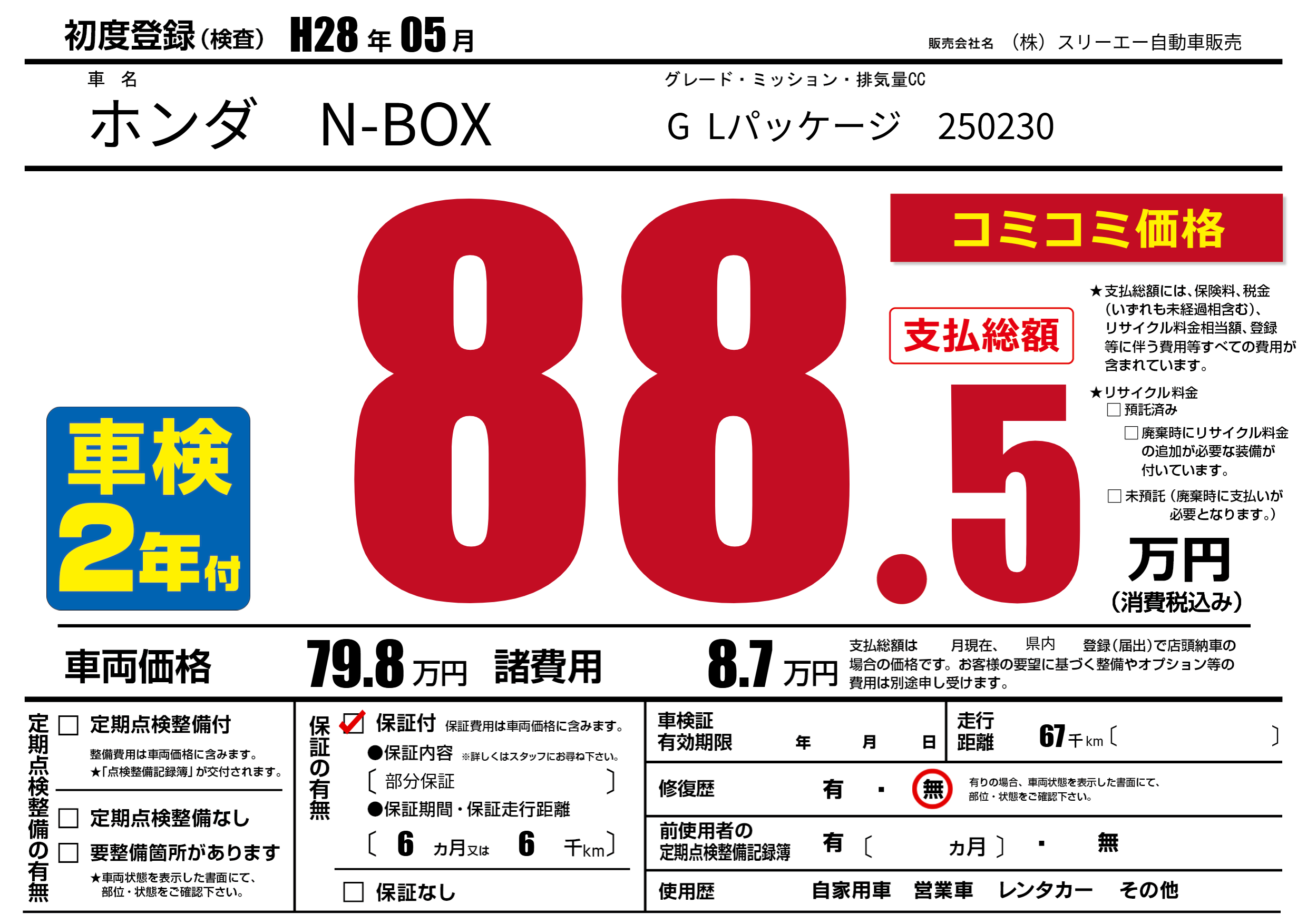 | 走行キロ | 6.7万km | 初年度登録 | H28年05月 |