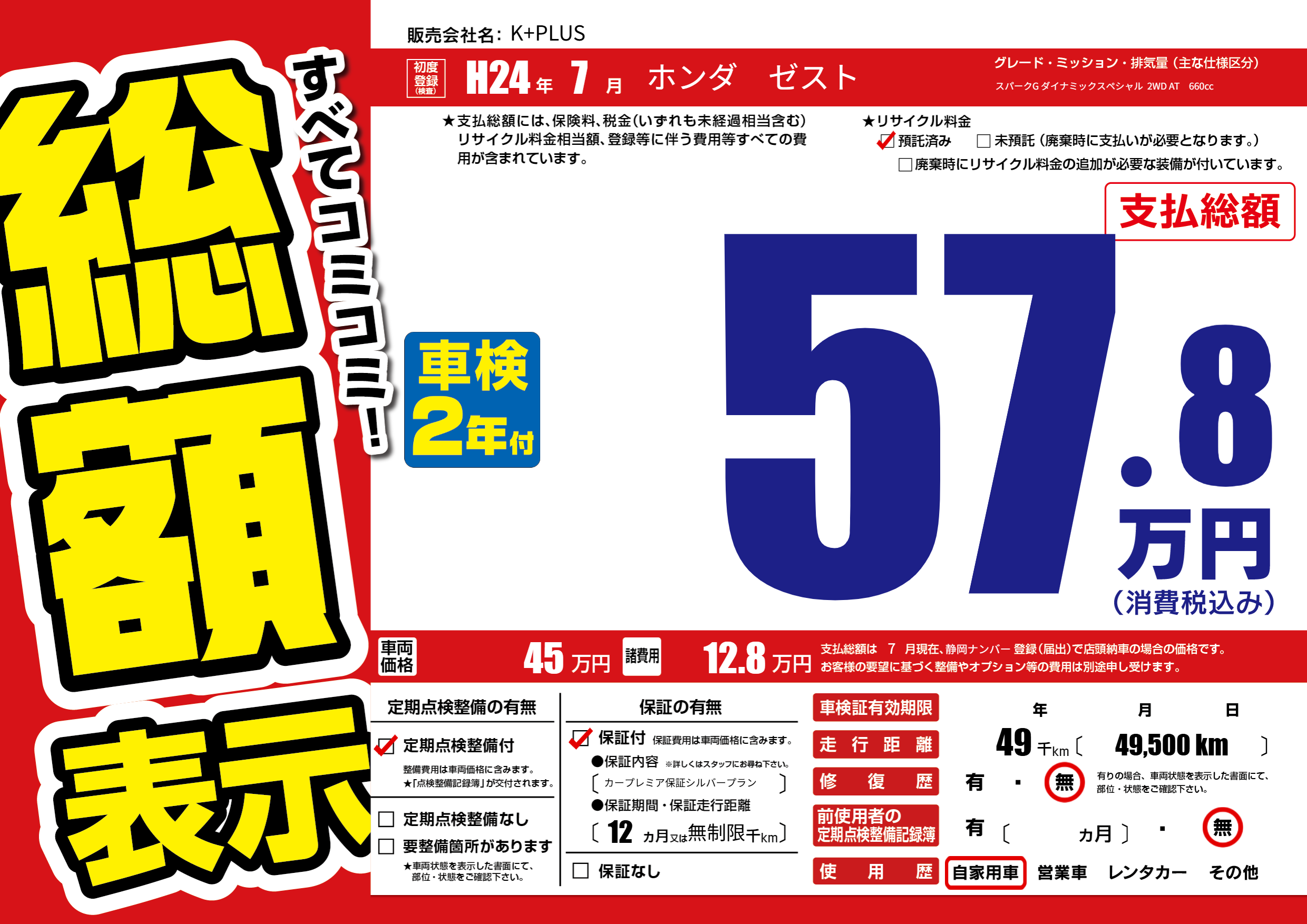 | 走行キロ | 4.9万km | 初年度登録 | H24年7月 |