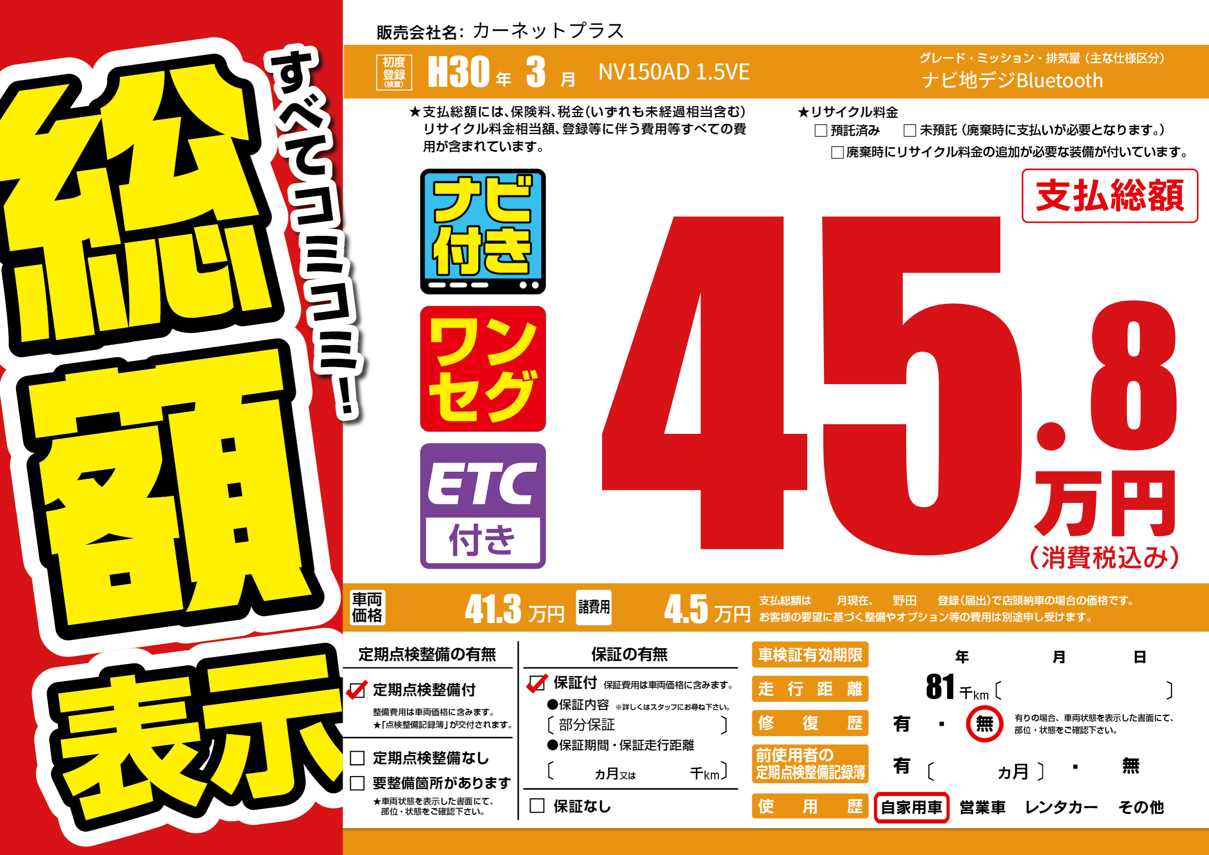 | 車名 | NV150AD 1.5VE | グレード ミッション 排気量 |