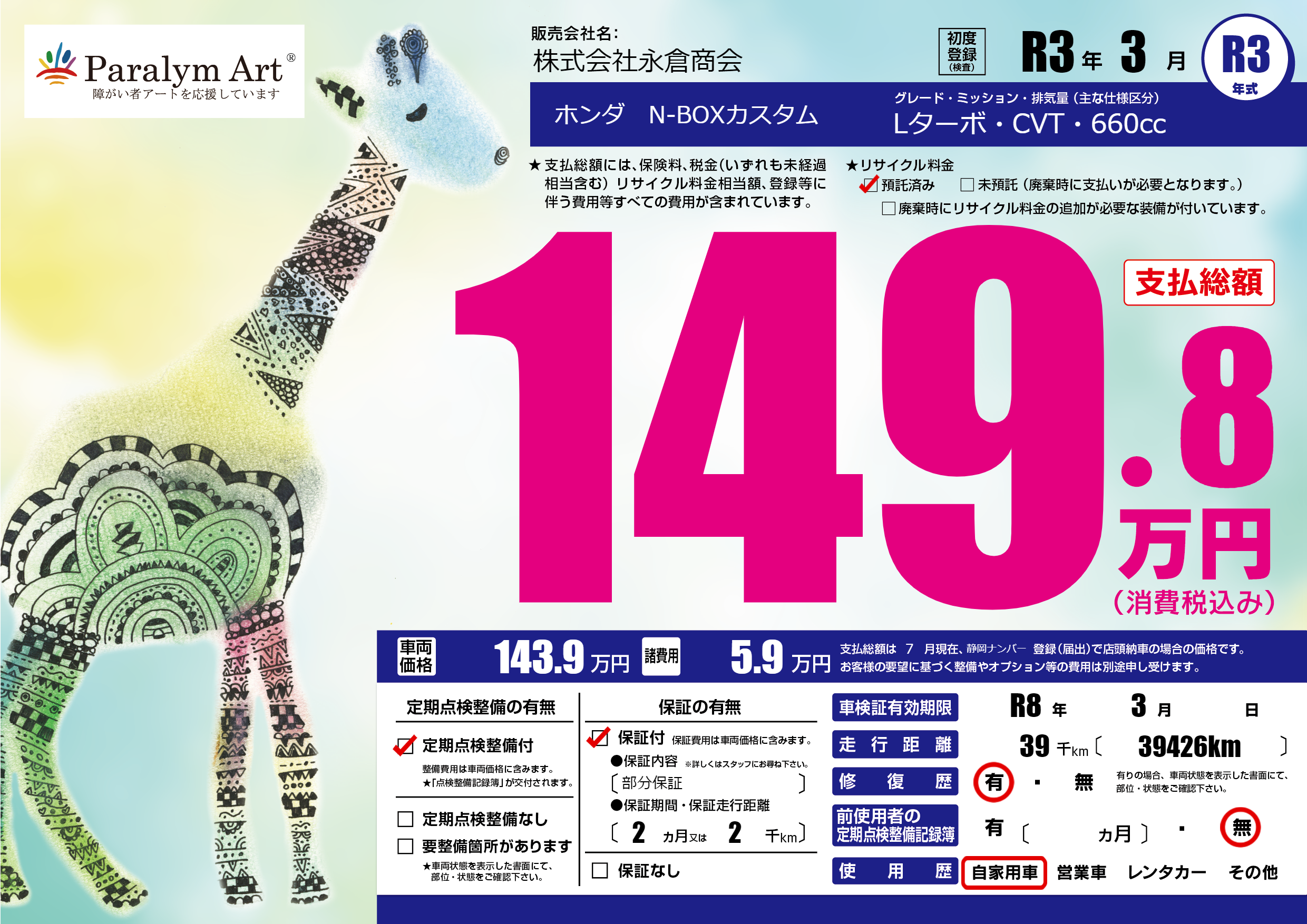 | 走行キロ | 3.9万km | 初年度登録 | R3年3月 |
