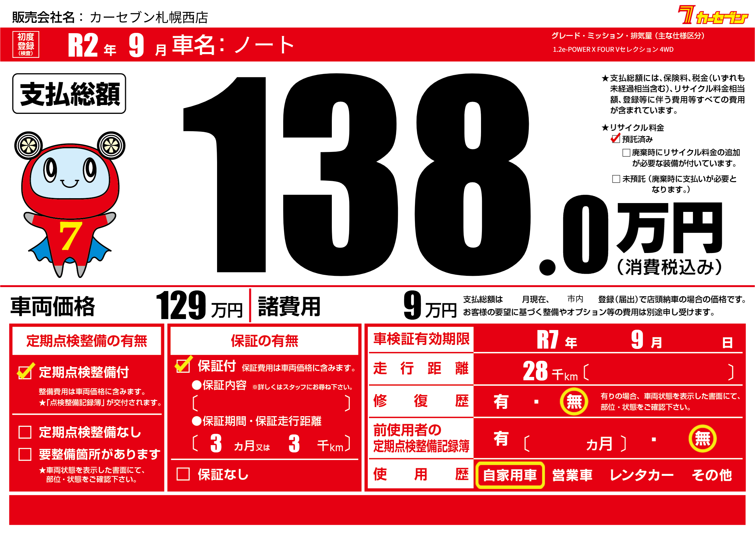 | 走行キロ | 2.8万km | 初年度登録 | R2年9月 |