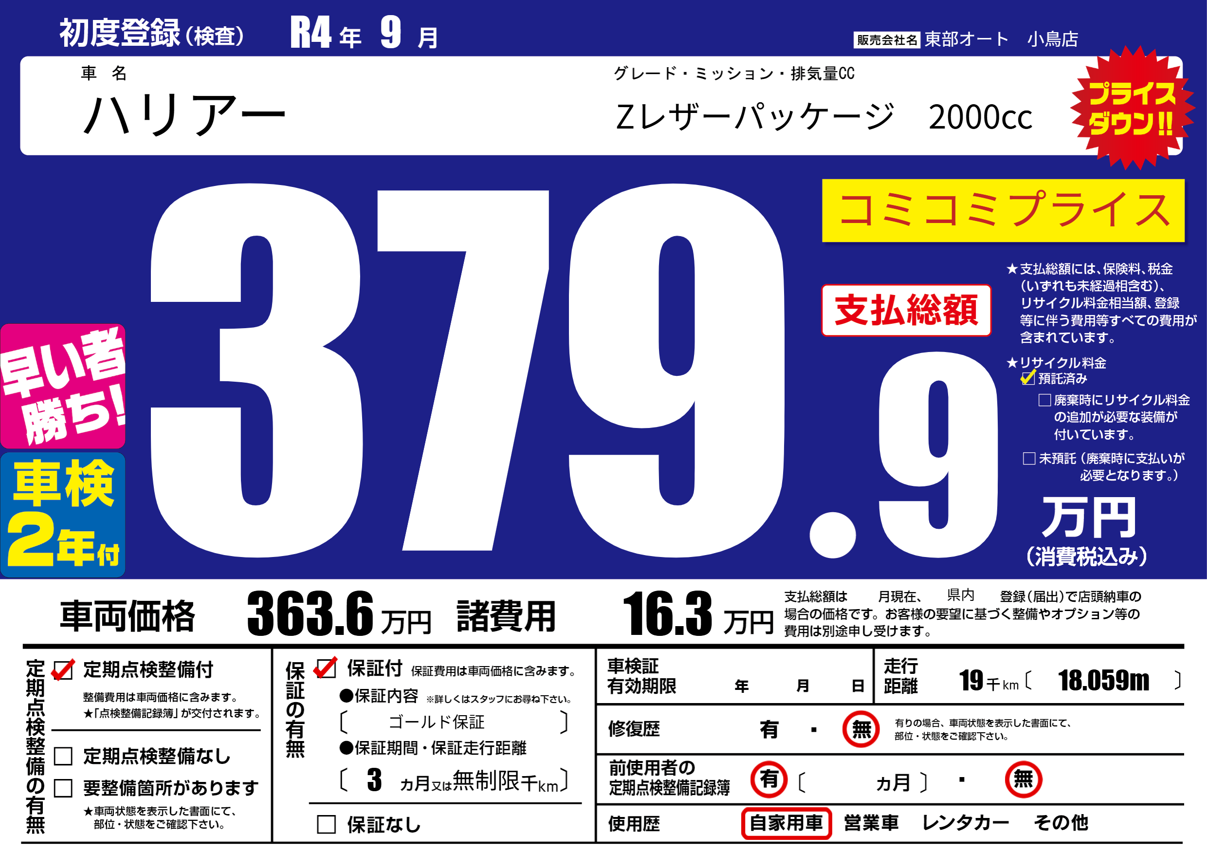 | 車名 | ハリアー | グレード ミッション 排気量 |