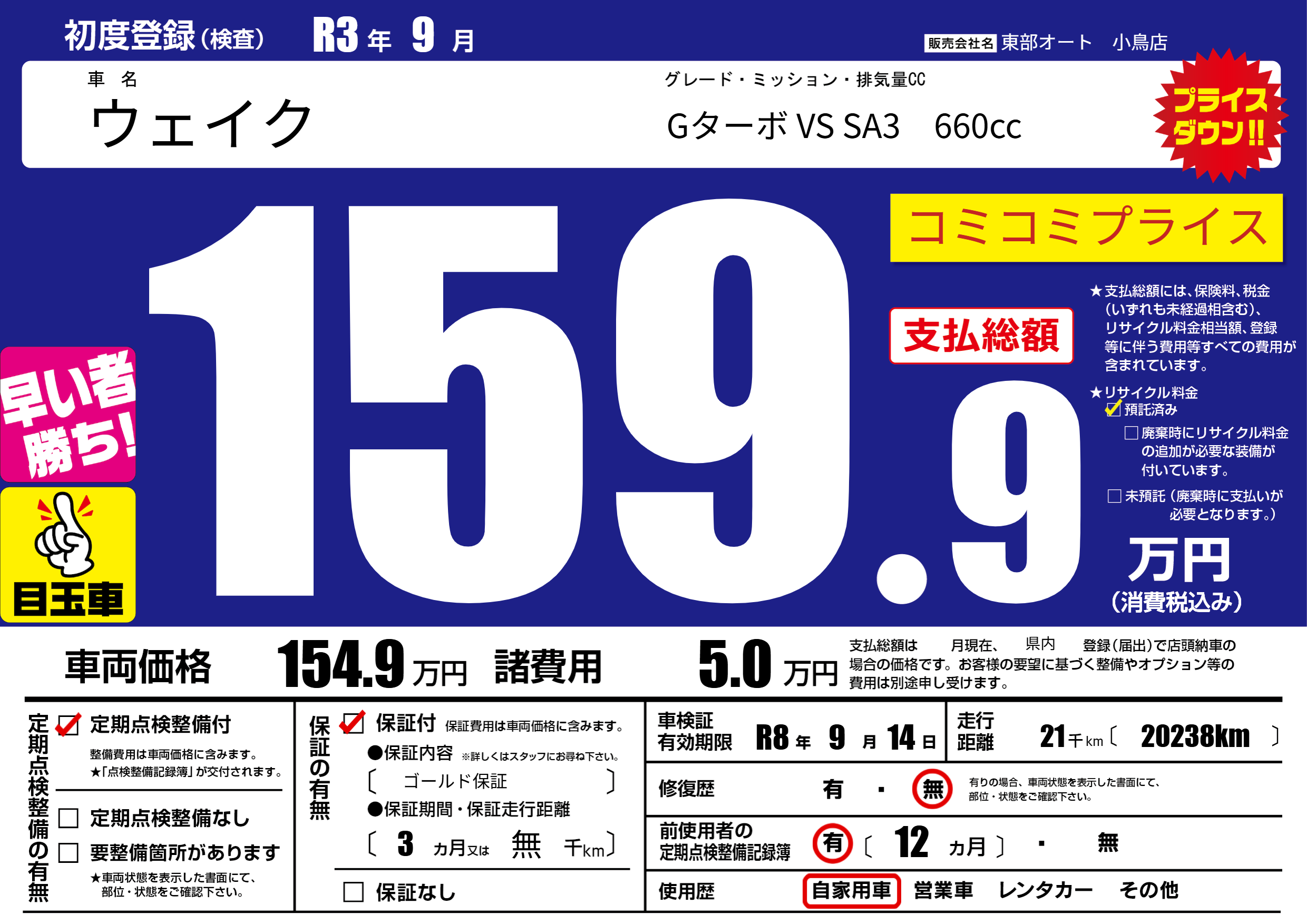 | 走行キロ | 2.1万km | 初年度登録 | R3年9月 |